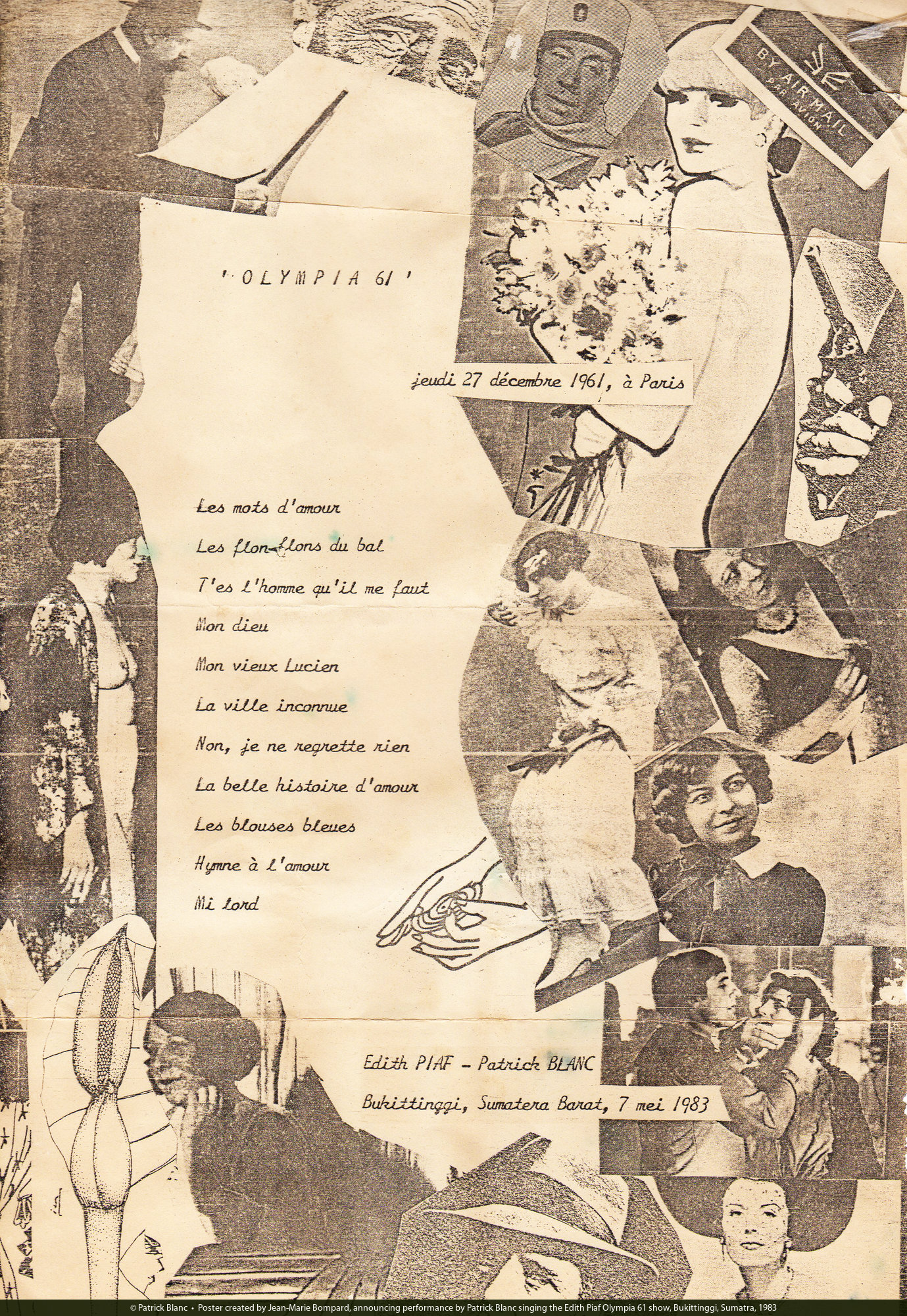 Poster created by Jean-Marie Bompard, announcing performance by Patrick Blanc singing the Edith Piaf Olympia 61 show, Bukittinggi, Sumatra, May 1983