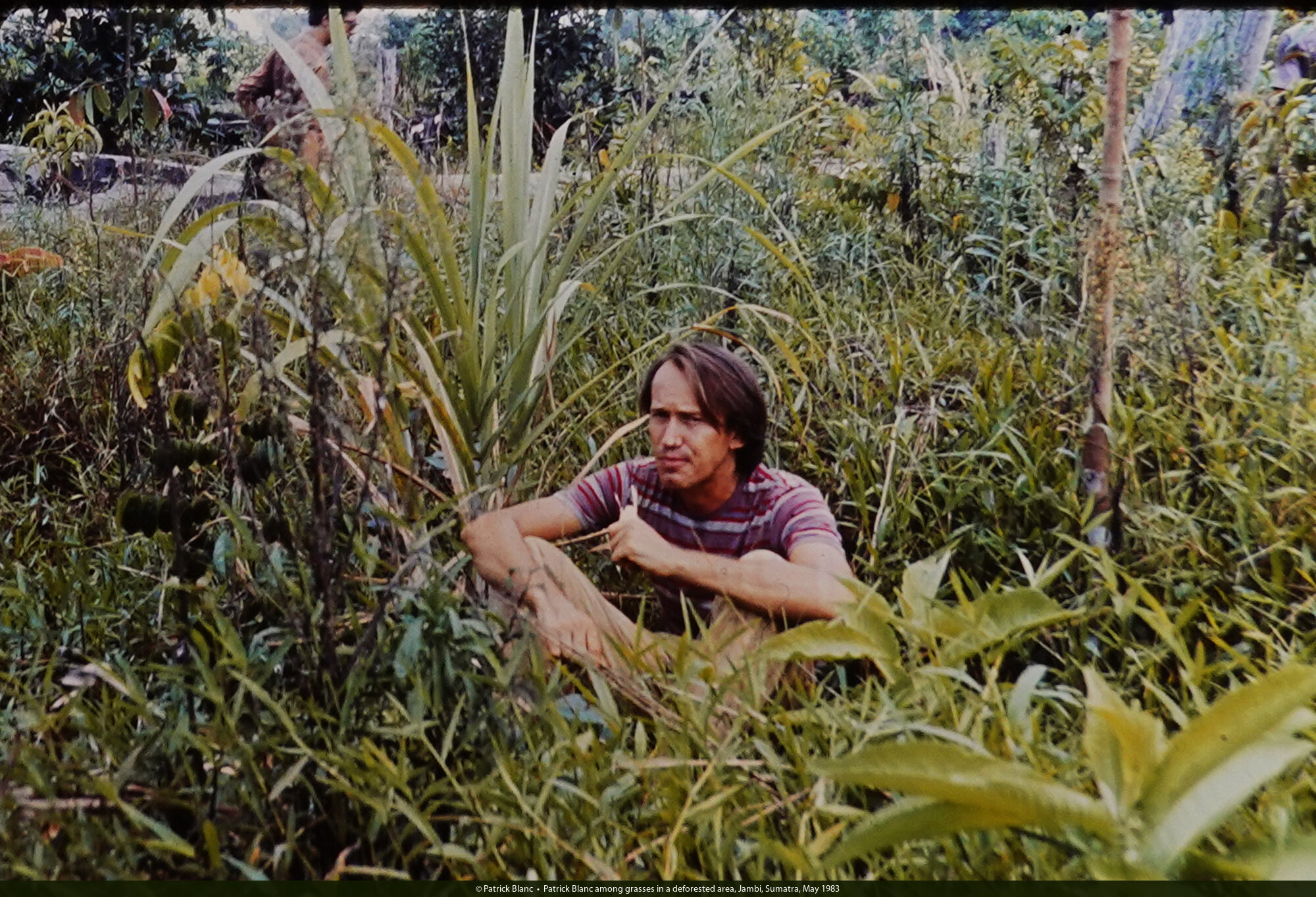 Patrick Blanc among grasses in a deforested area, Jambi, Sumatra, May 1983