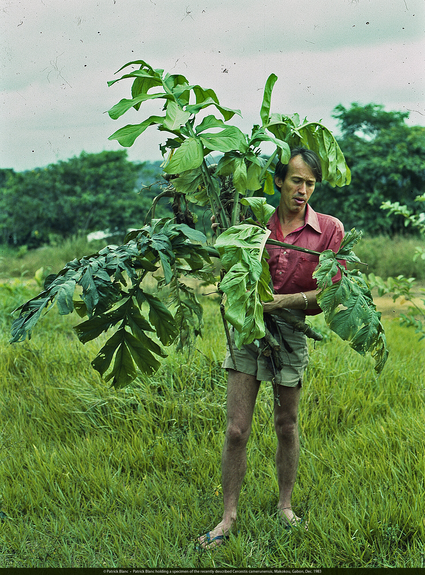 Patrick Blanc holding a freshly collected specimen of Cercestis (syn. Rhektophyllum) camerunensis at the Research Field Station, Makokou, Gabon, Dec. 1983