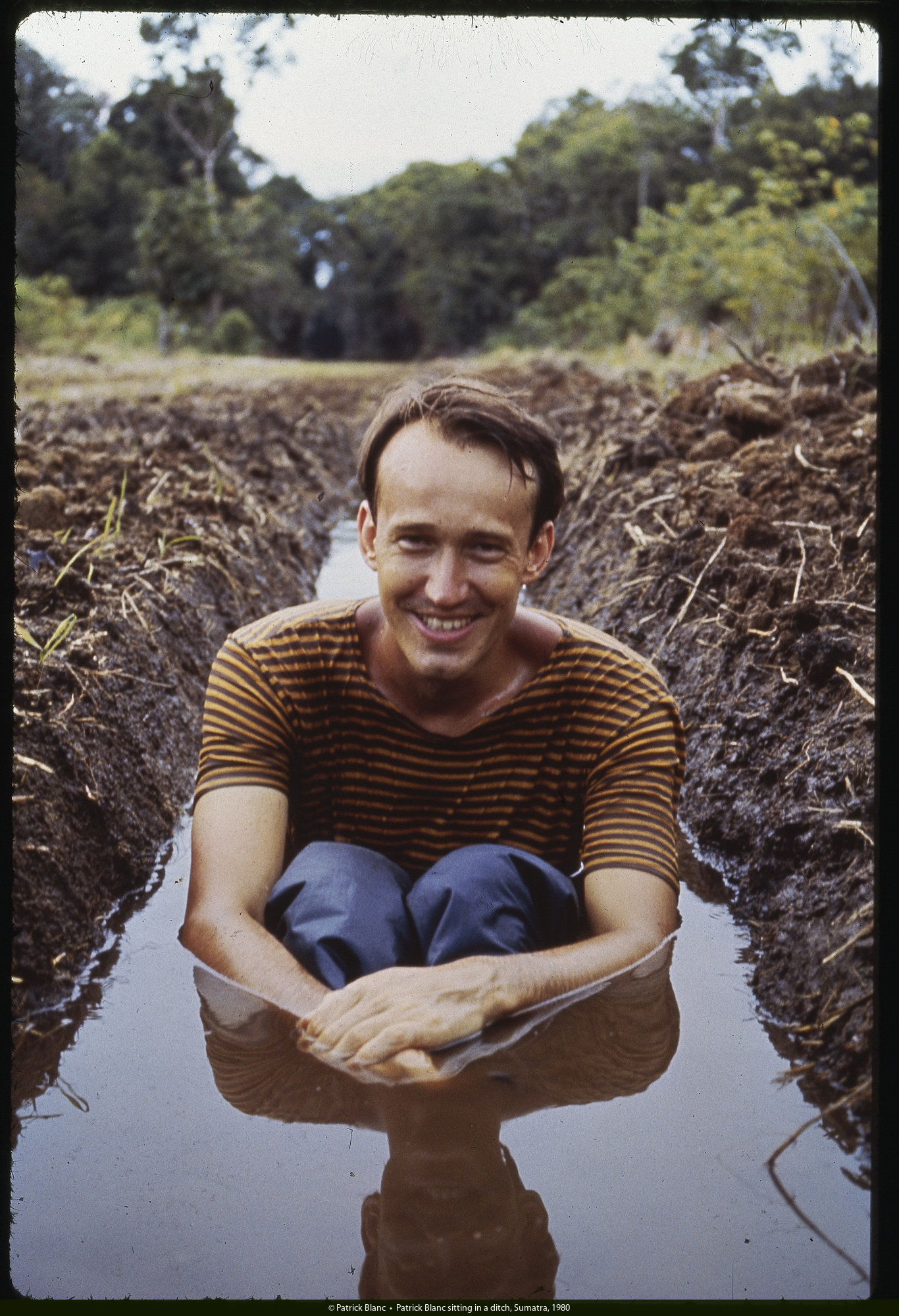Patrick Blanc sitting in a ditch, Sumatra, May 1983