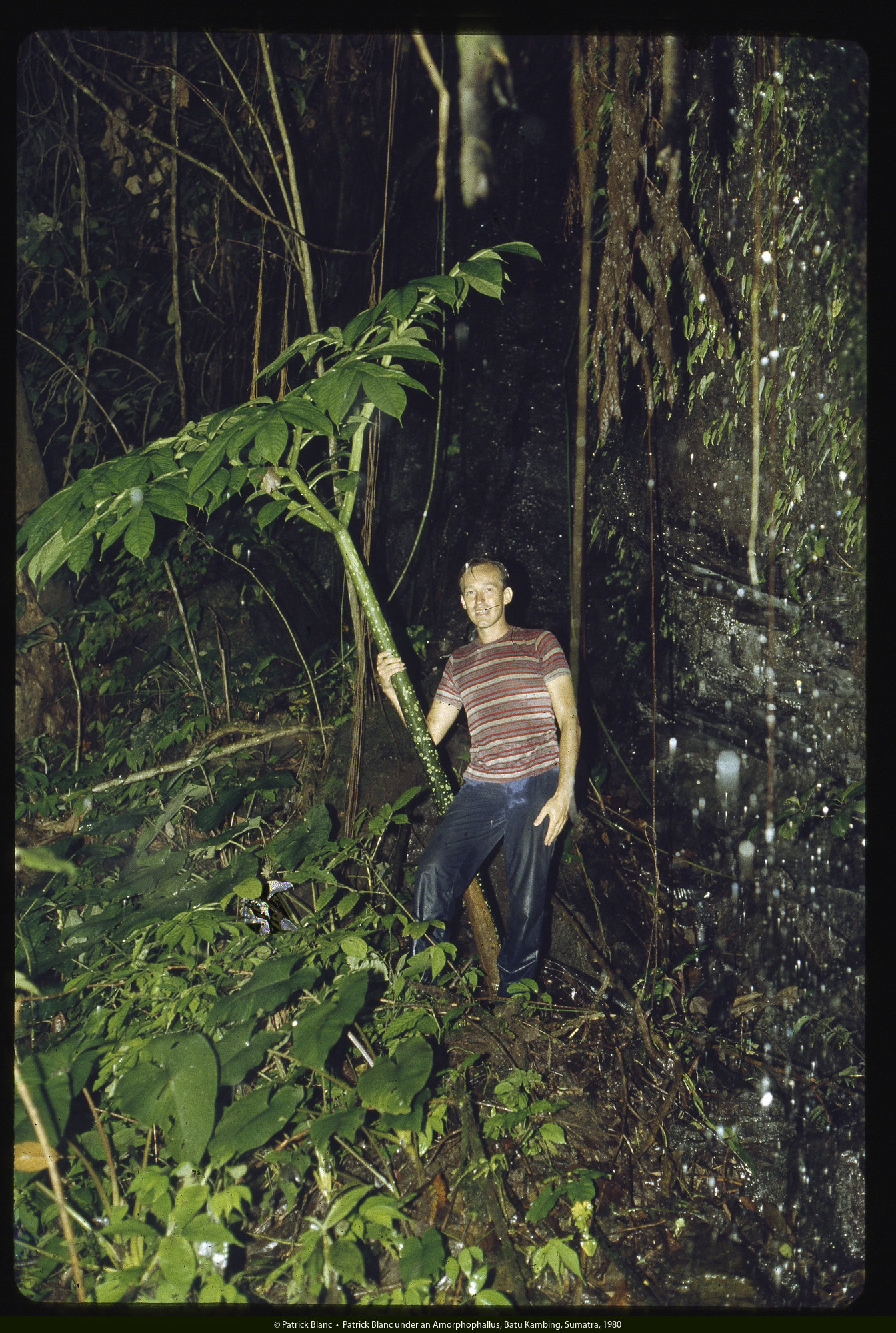 Patrick Blanc under an Amorphophallus, Batu Kambing, Sumatra, May 1983