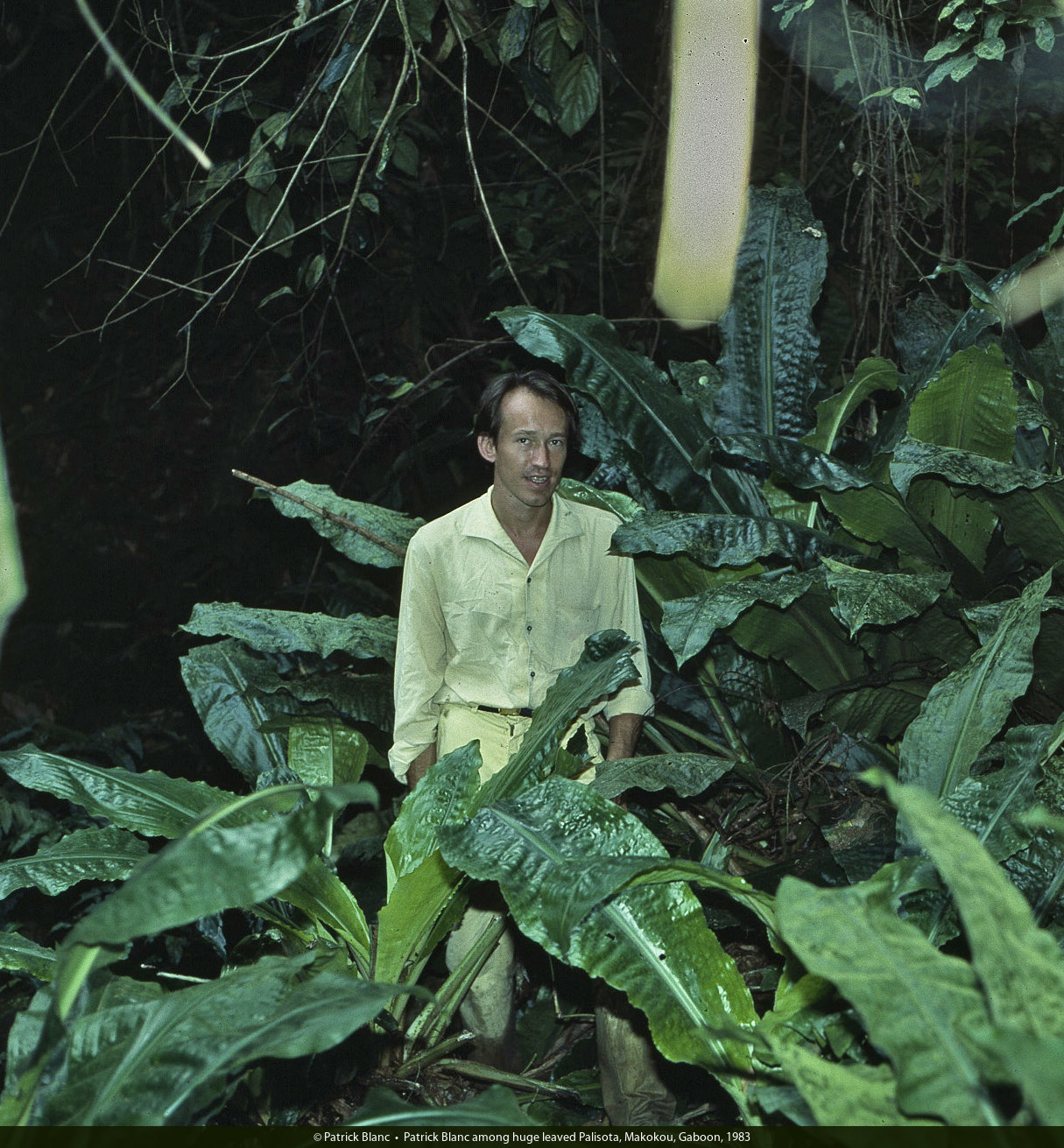 Patrick Blanc among huge leaved Palisota, Makokou, Gabon, Dec. 1983
