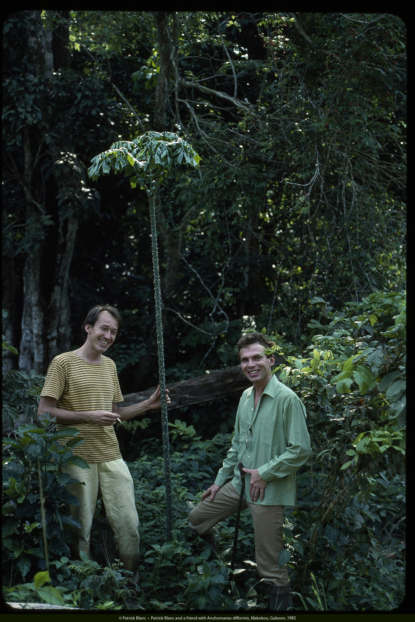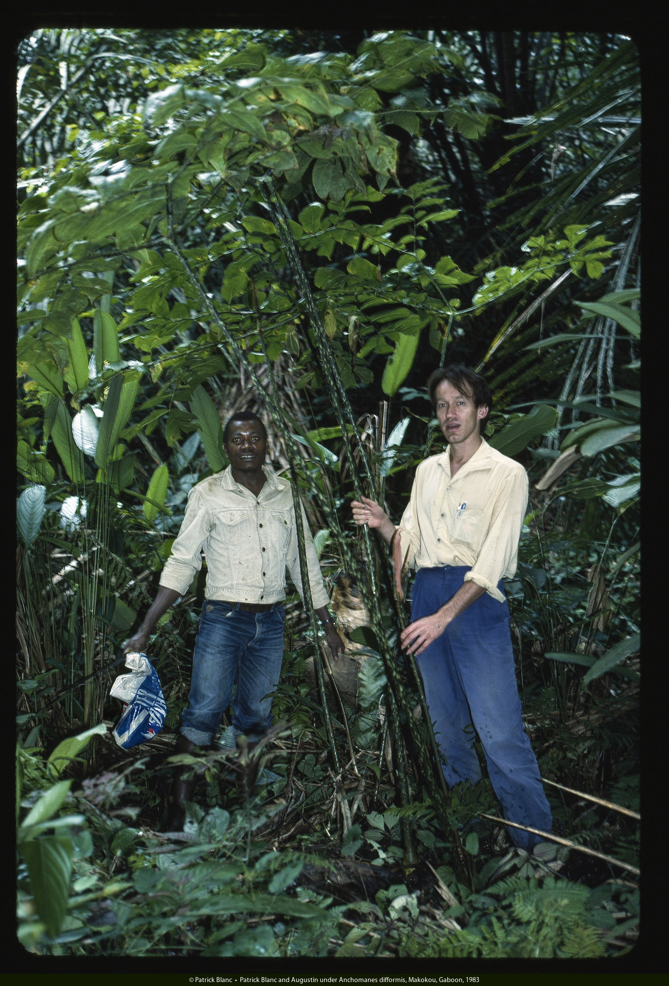 Patrick Blanc and a friend with Anchomanes difformis, Makokou, Gabon, Dec. 1983