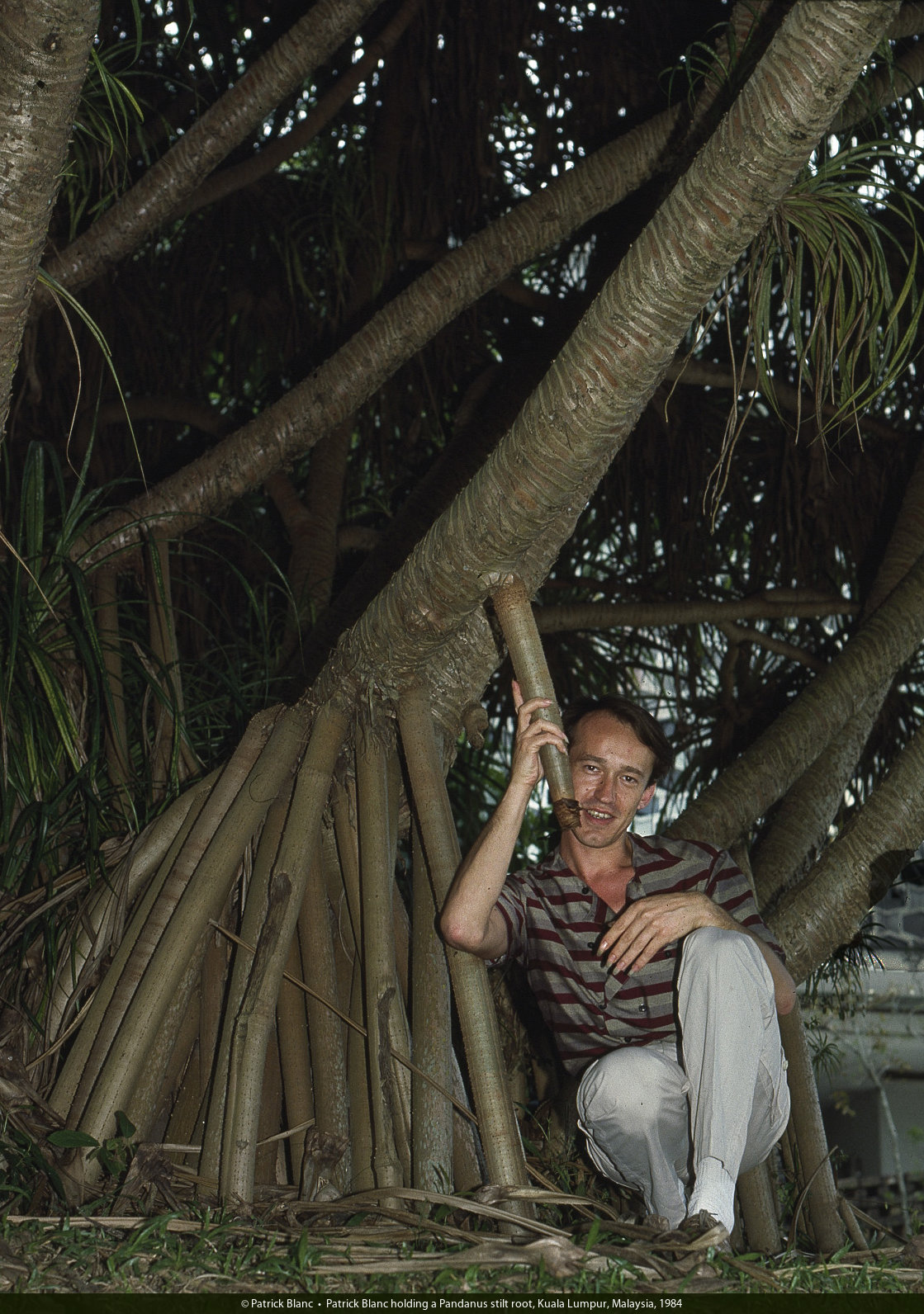 Patrick Blanc holding a Pandanus stilt root, Kuala Lumpur, Malaysia, Aug. 1984