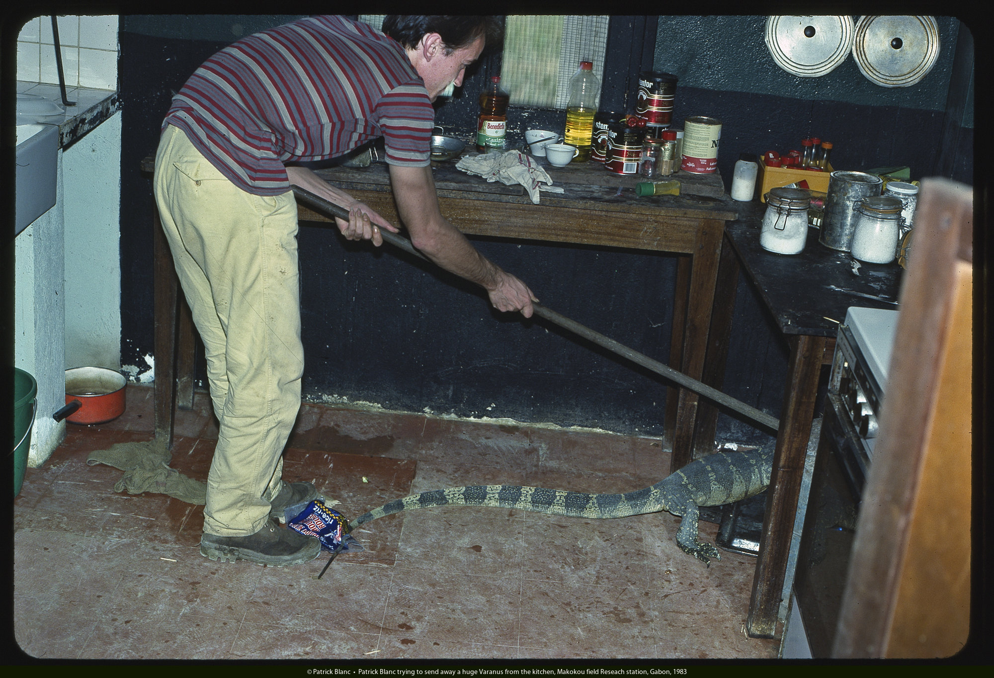 Patrick Blanc trying to send away a huge Varanus from the kitchen, Makokou field Reseach station, Gabon, Dec. 1983
