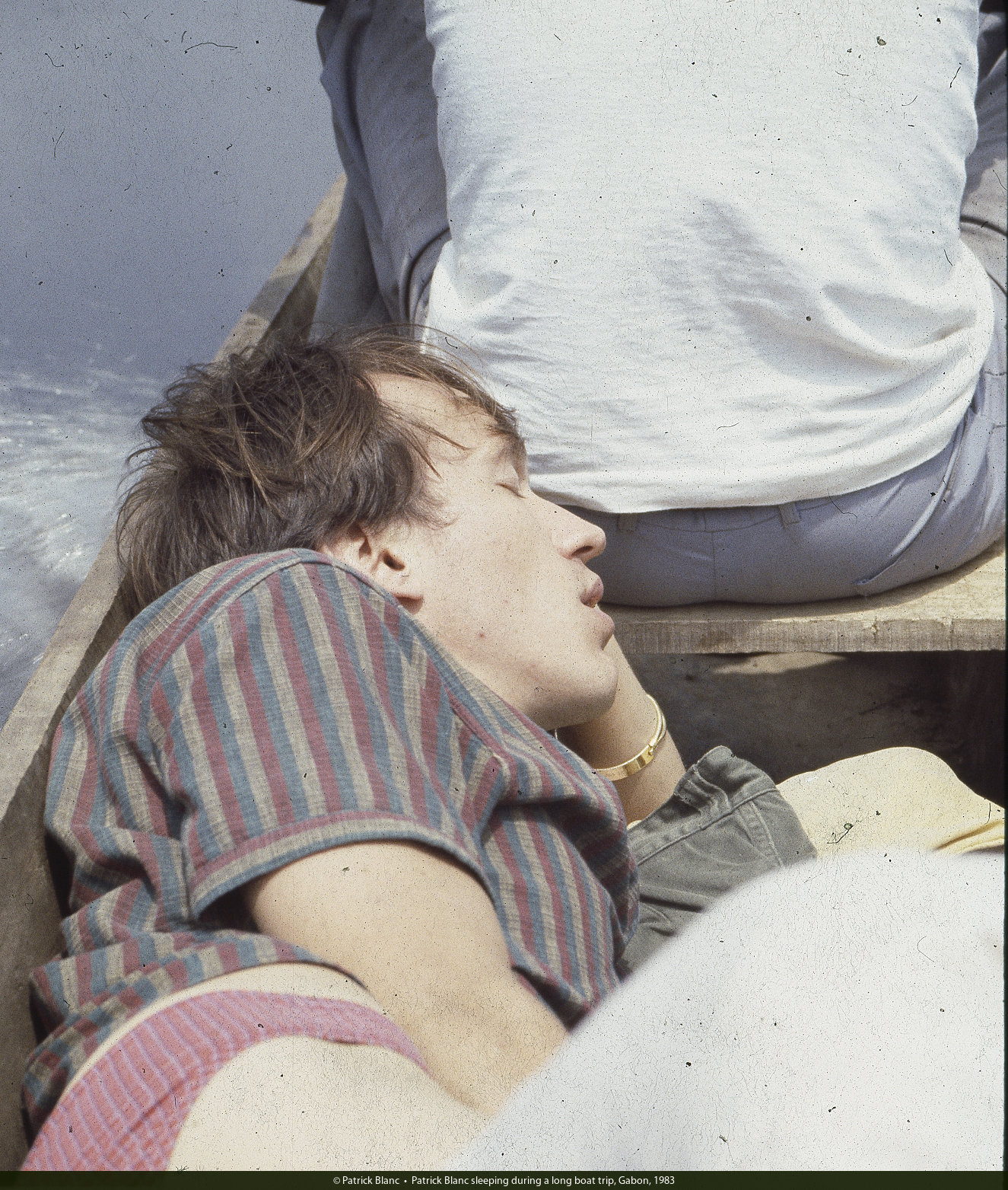 Patrick Blanc sleeping during a long boat trip, Gabon, Dec. 1983