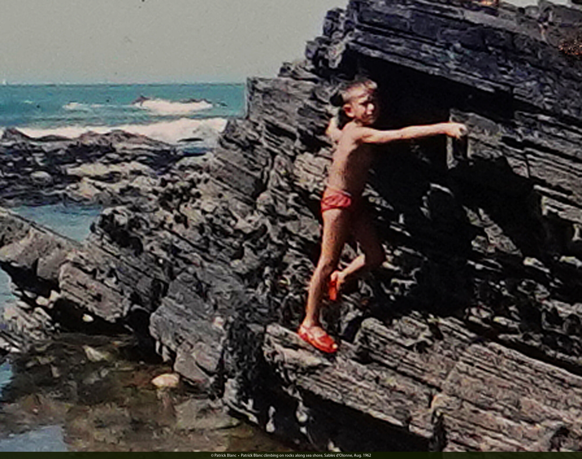 • Patrick Blanc climbing on rocks along sea shore, Sables d'Olonne, Aug. 1962