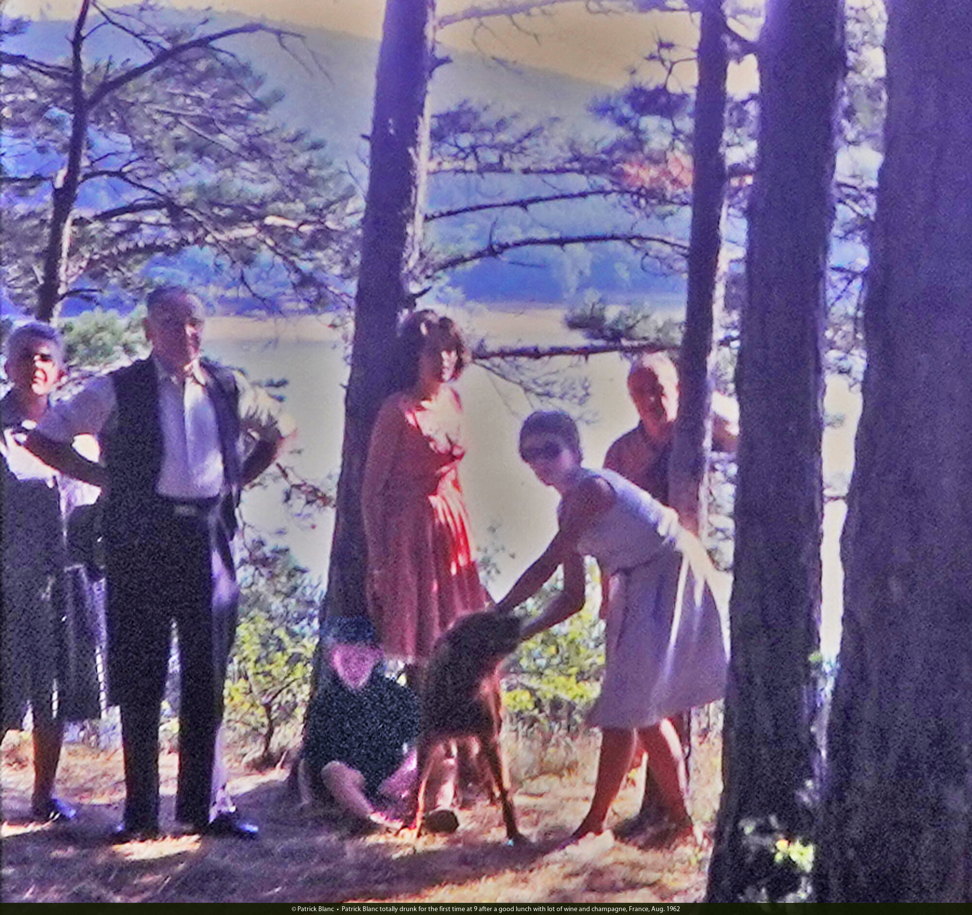 • Patrick Blanc totally drunk for the first time at 9 after a good lunch with lot of wine and champagne, France, Aug. 1962