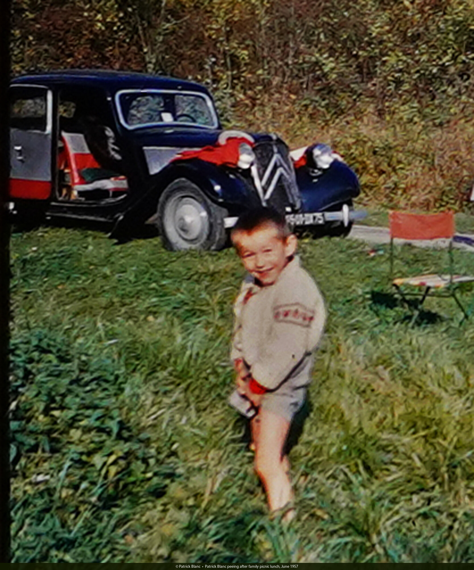 Patrick Blanc peeing after family picnic lunch, June 1957