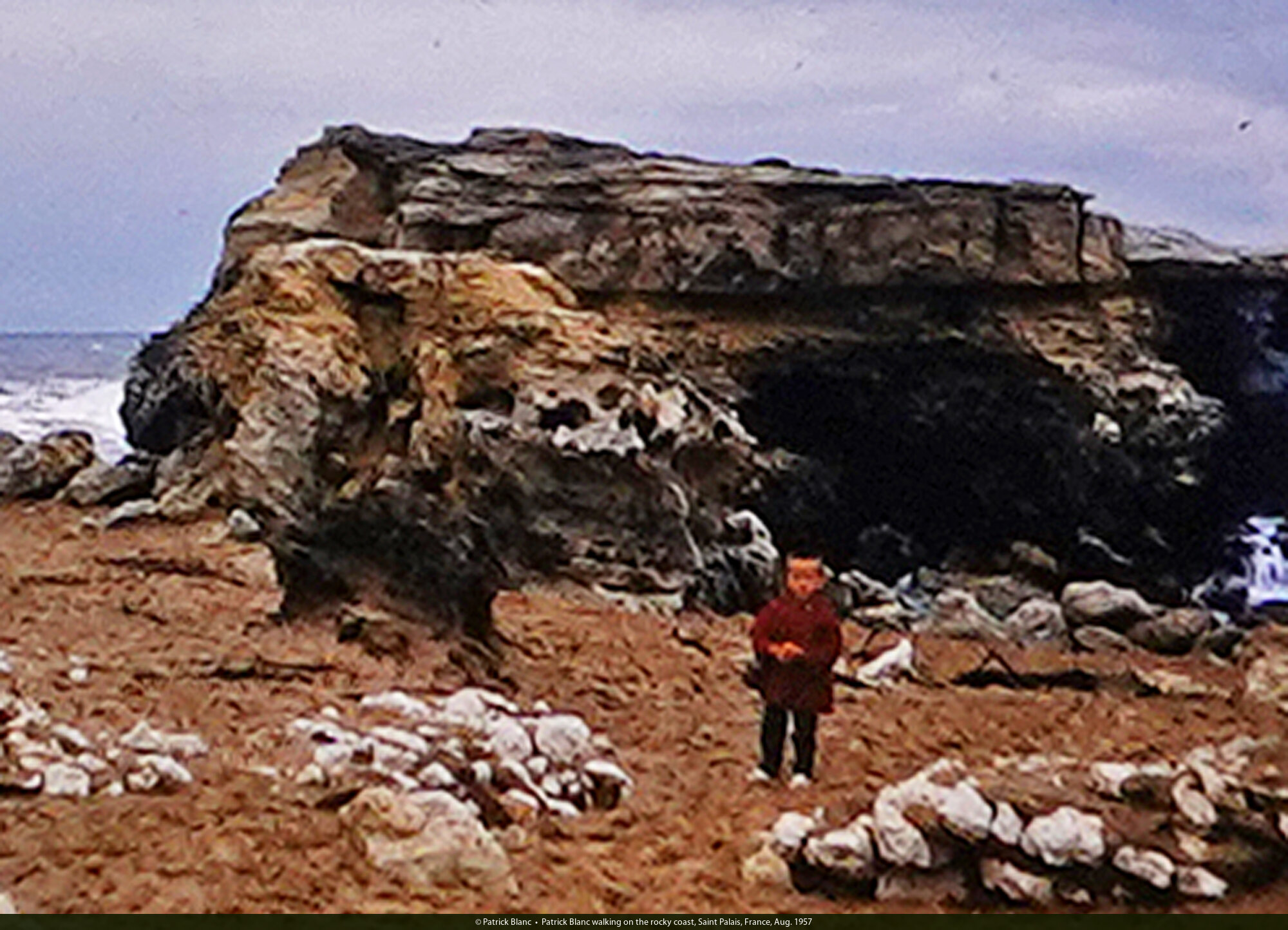 Patrick Blanc walking on the rocky coast, Saint Palais, France, Aug. 1957