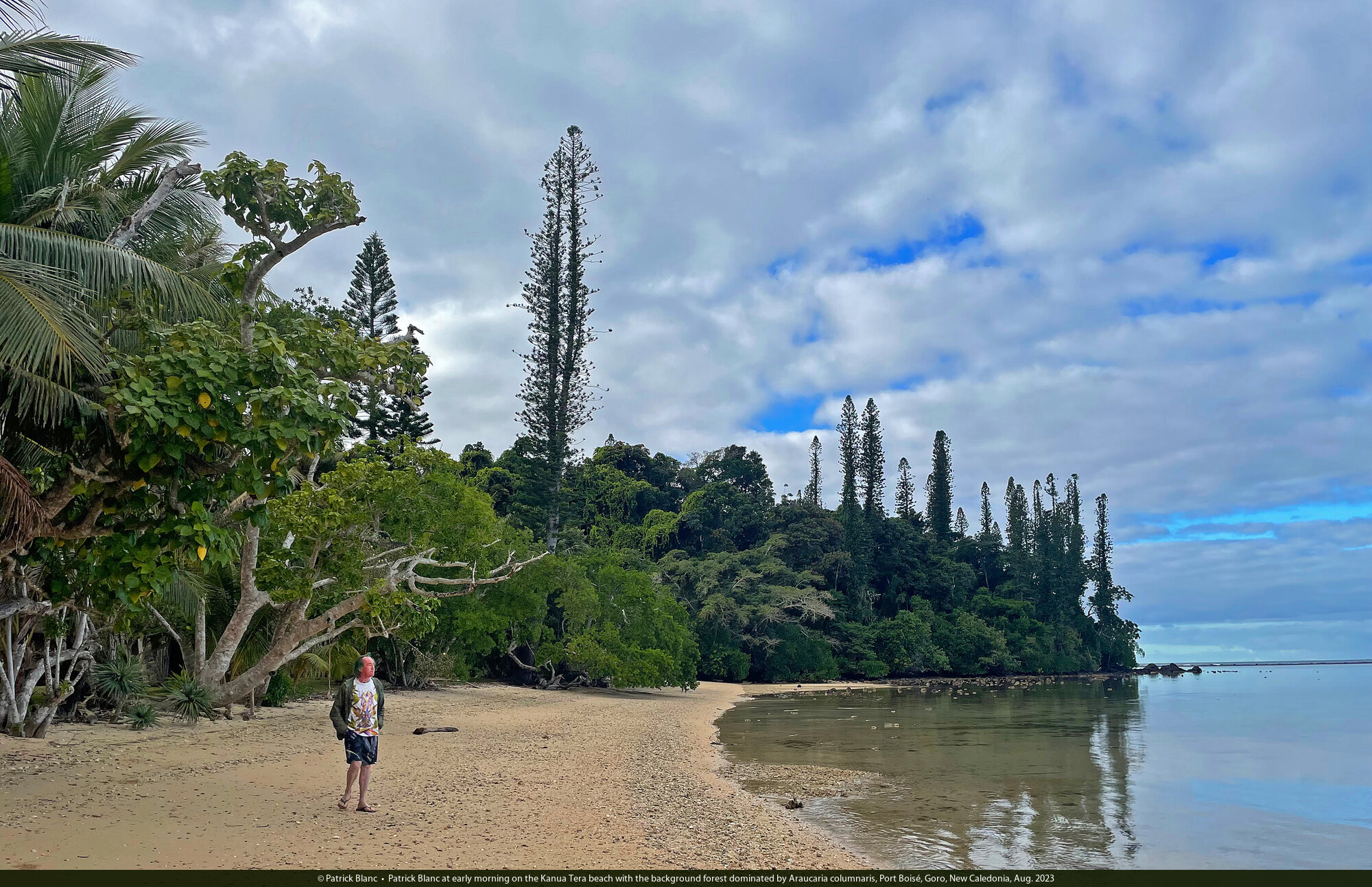 Patrick Blanc at early morning on the Kanua Tera beach with the background forest dominated by Araucaria columnaris, Port Boisé, Goro, New Caledonia, Aug. 2023