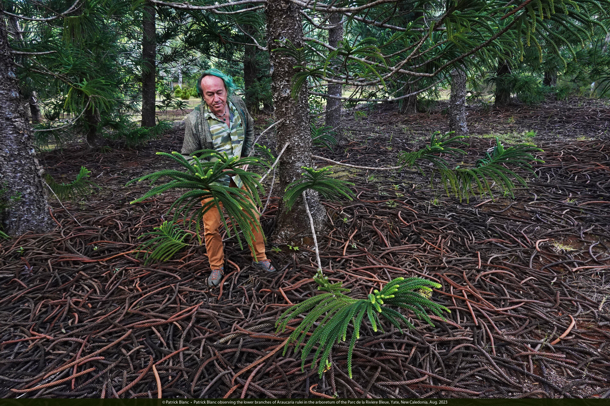 Patrick Blanc observing the lower branches of Araucaria rulei in the arboretum of the Parc de la Riviere Bleue, Yate, New Caledonia, Aug. 2023