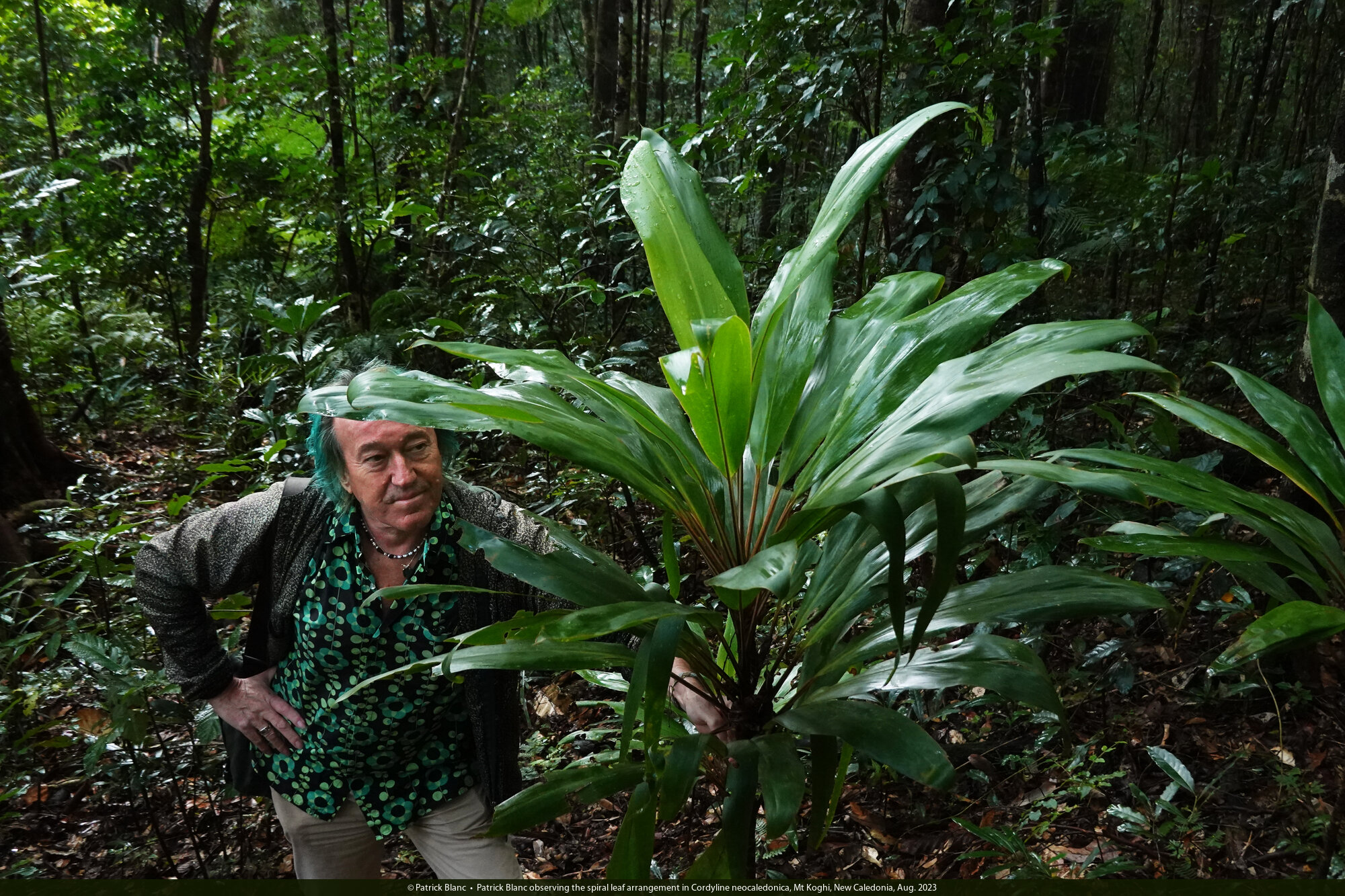 Patrick Blanc observing the spiral leaf arrangement in Cordyline neocaledonica, Mt Koghi, New Caledonia, Aug. 2023