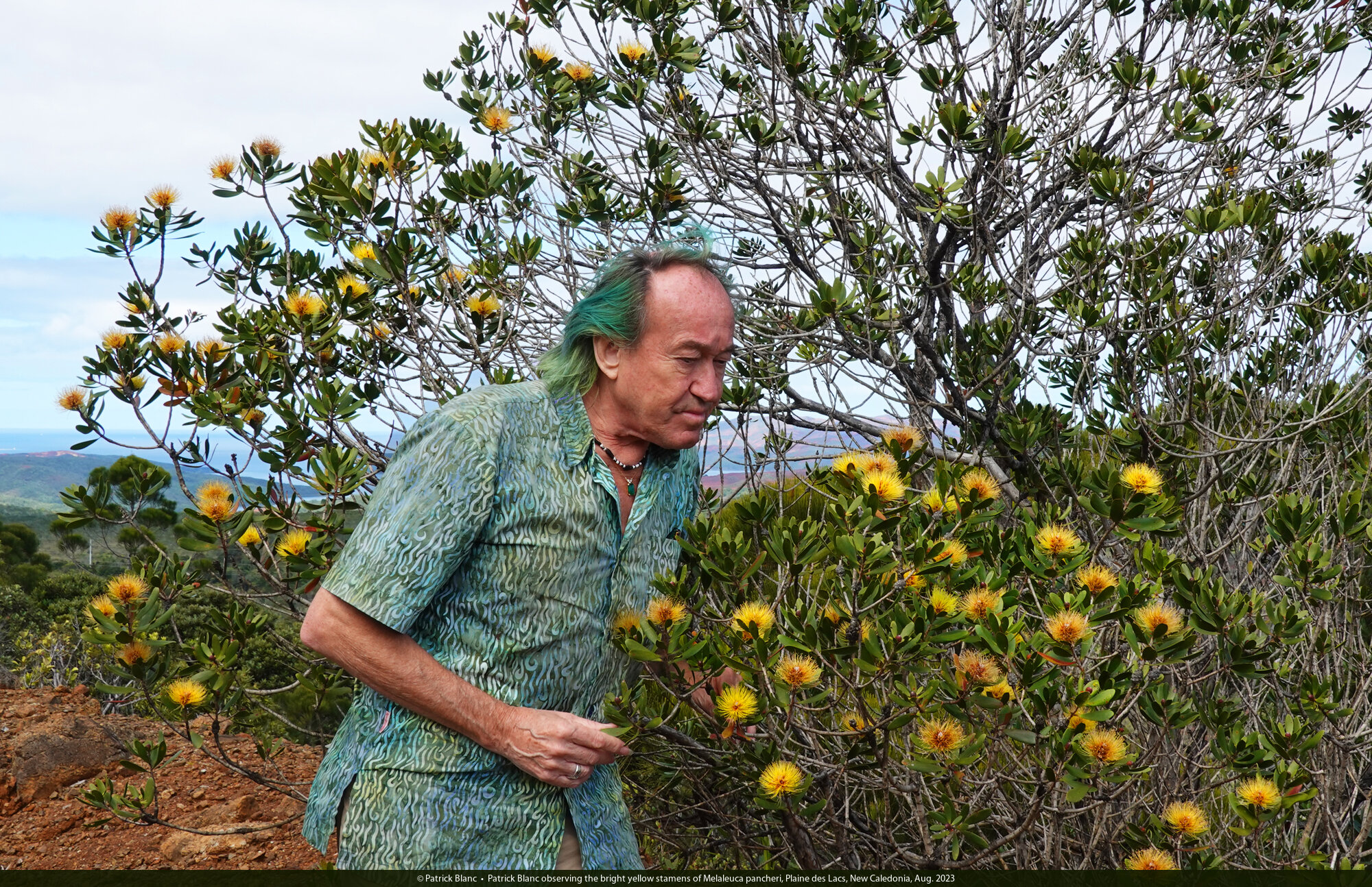 Patrick Blanc observing the bright yellow stamens of Melaleuca pancheri, Plaine des Lacs, New Caledonia, Aug. 2023