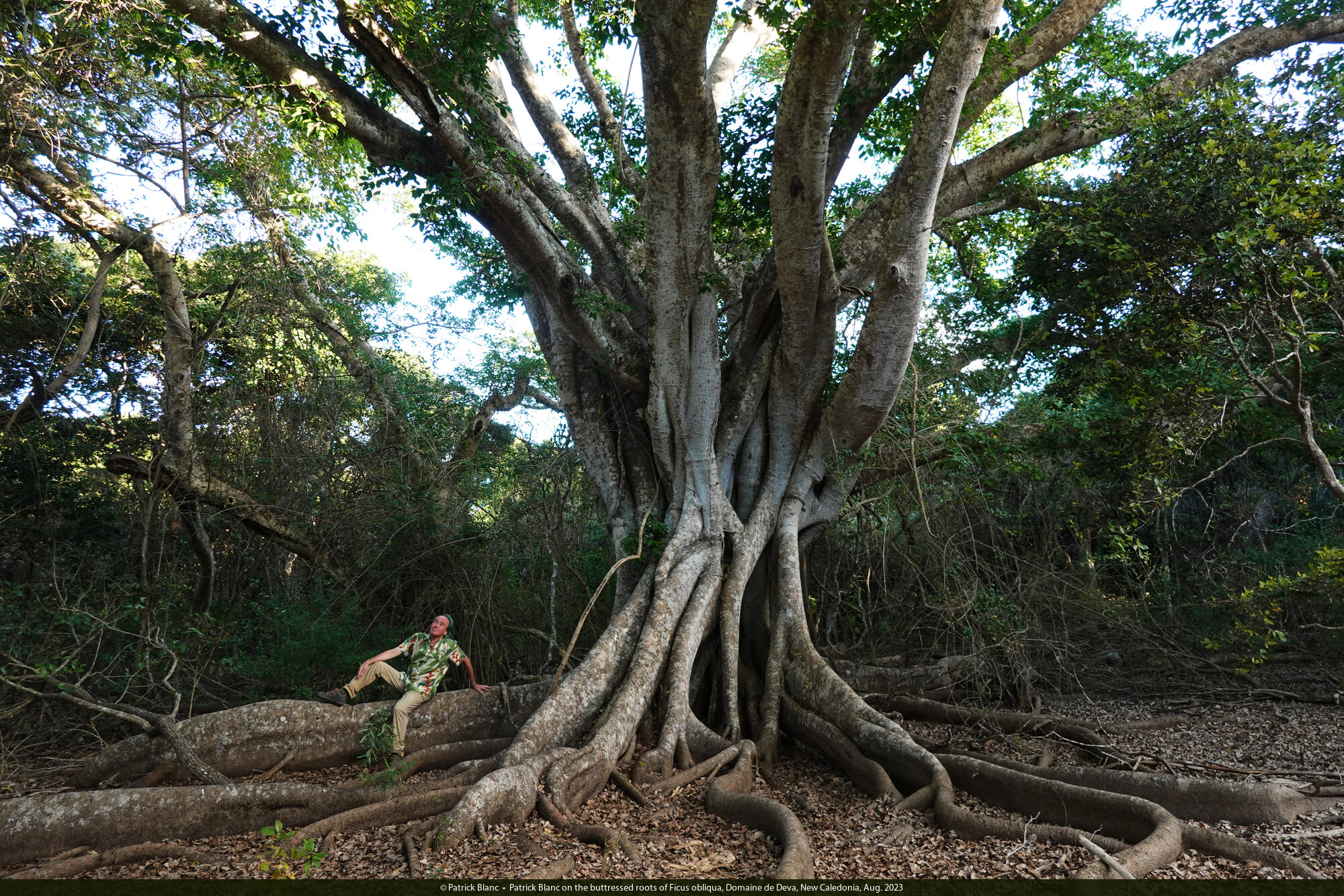 Patrick Blanc on the buttressed roots of Ficus obliqua, Domaine de Deva, New Caledonia, Aug. 2023