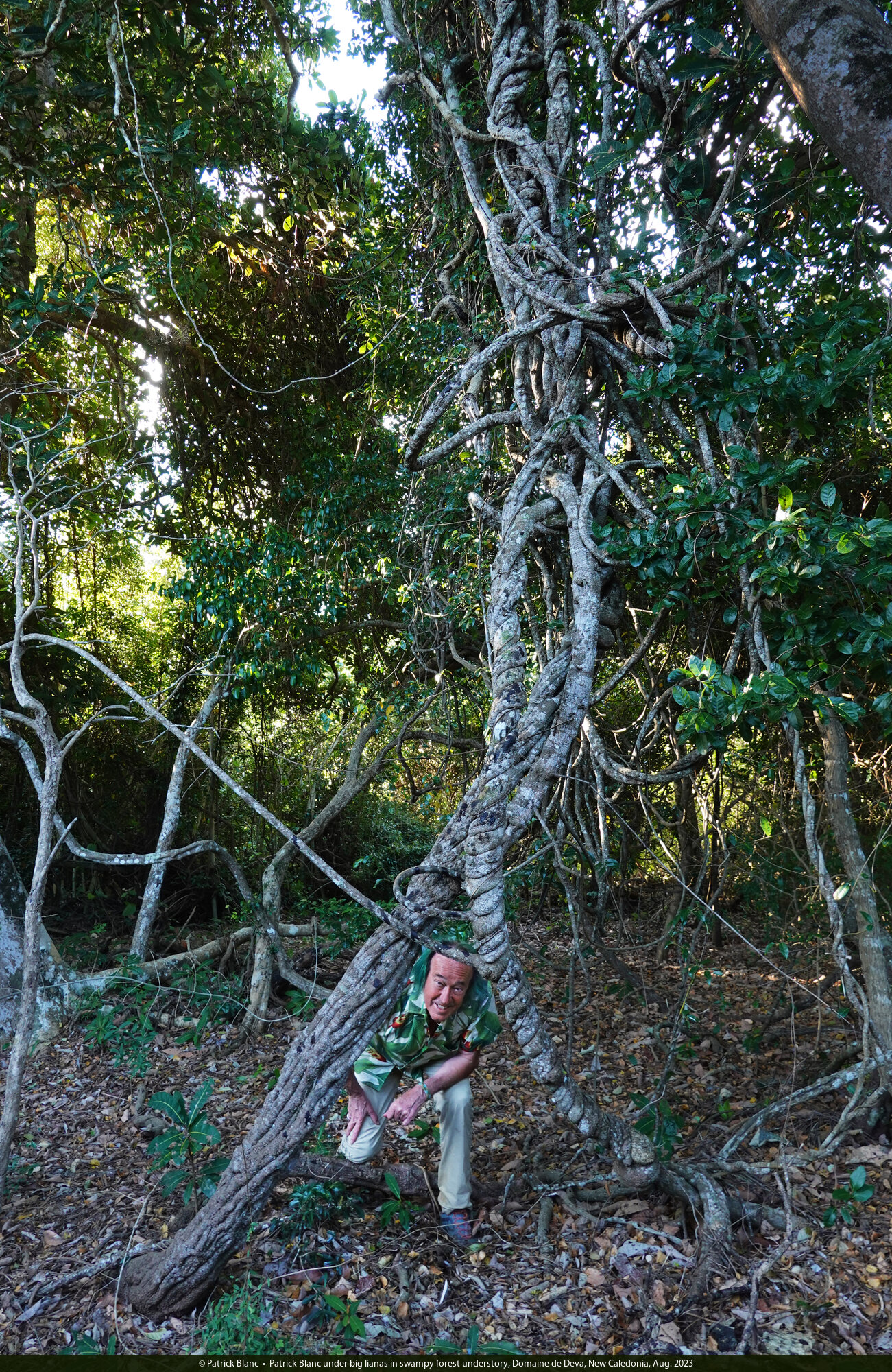 Patrick Blanc under big lianas in swampy forest understory, Domaine de Deva, New Caledonia, Aug. 2023