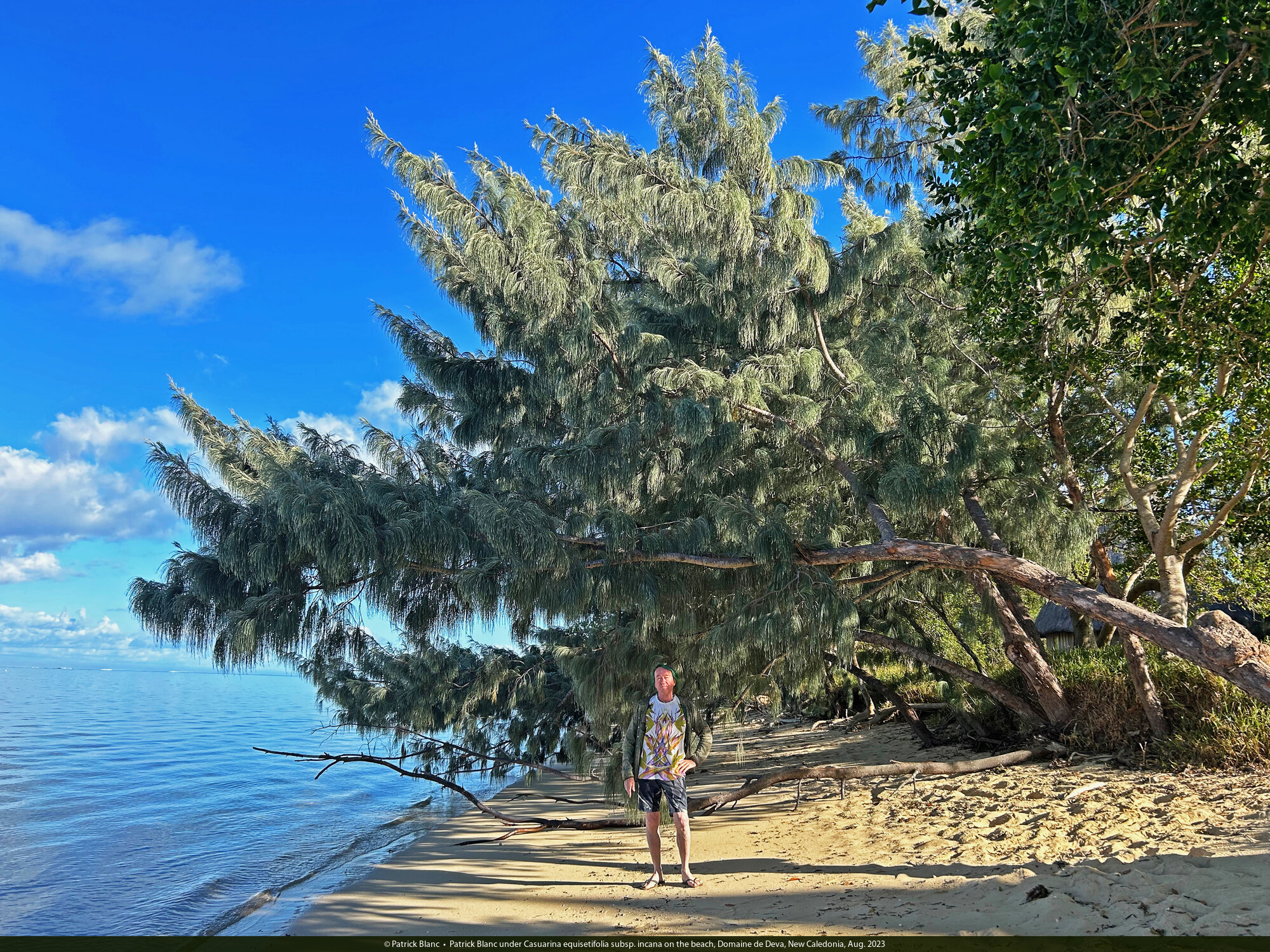 Patrick Blanc under Casuarina equisetifolia subsp. incana on the beach, Domaine de Deva, New Caledonia, Aug. 2023