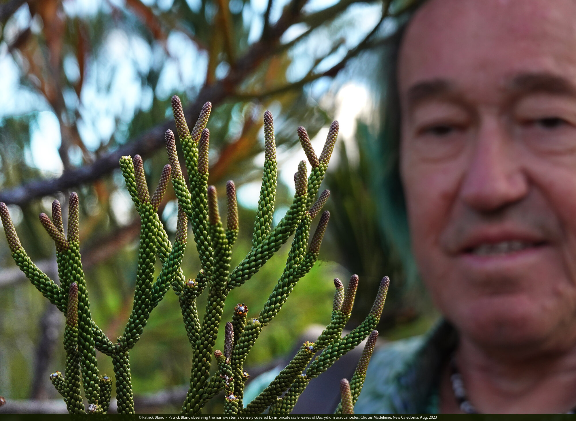 Patrick Blanc observing the narrow stems densely covered by imbricate scale leaves of Dacrydium araucarioides, Chutes Madeleine, New Caledonia, Aug. 2023