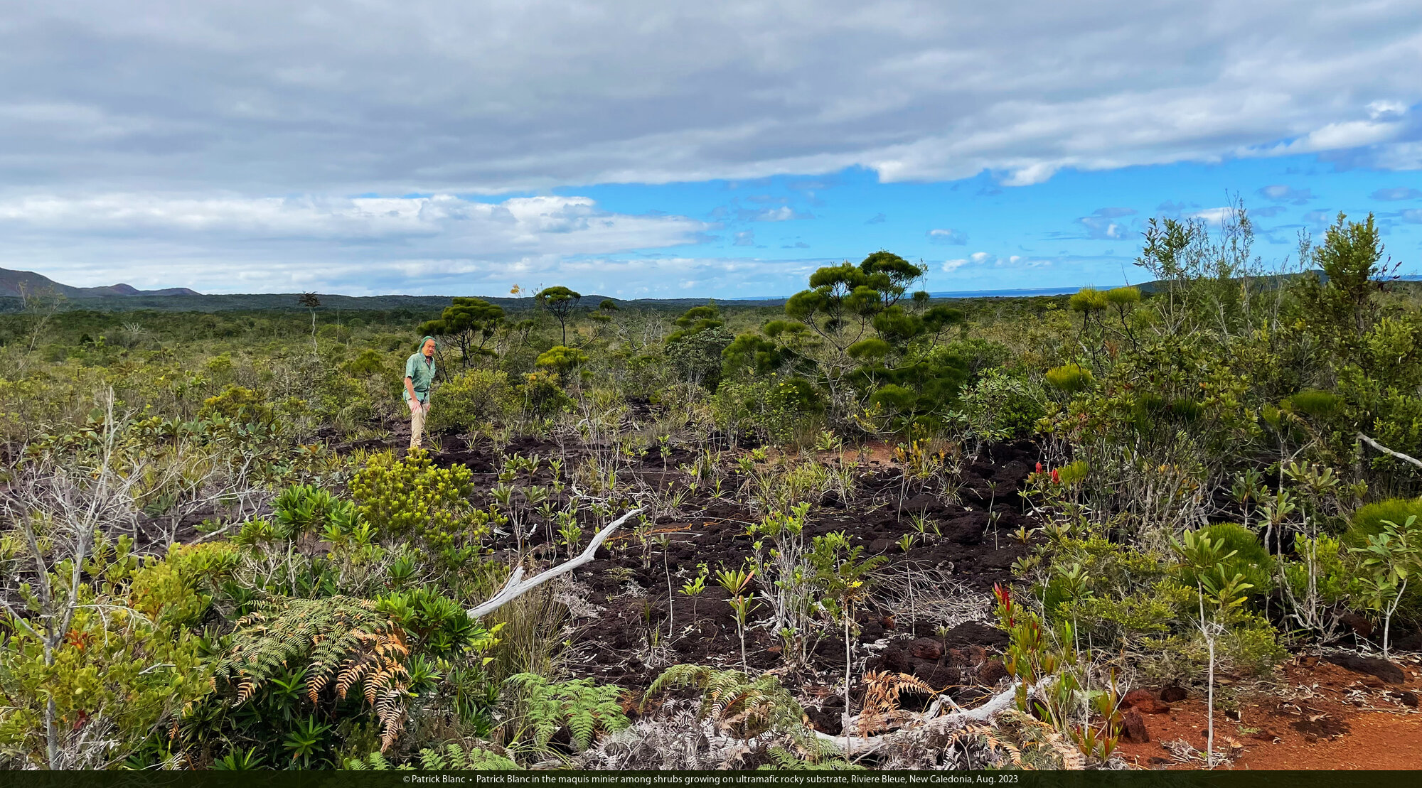 Patrick Blanc in the maquis minier among shrubs growing on ultramafic rocky substrate, Riviere Bleue, New Caledonia, Aug. 2023
