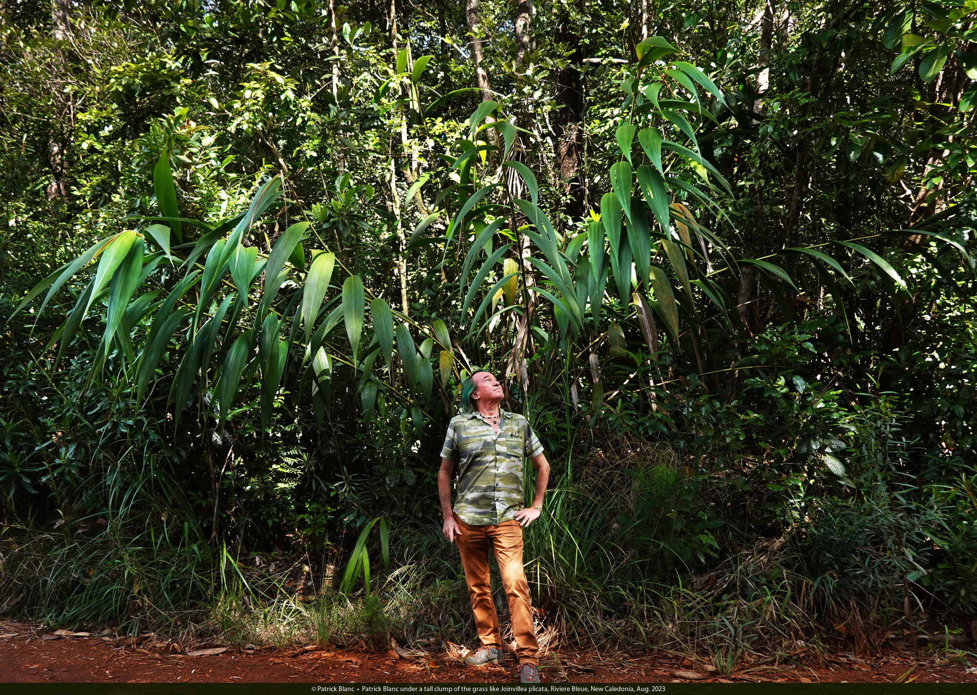 Patrick Blanc under a tall clump of the grass like Joinvillea plicata, Riviere Bleue, New Caledonia, Aug. 2023