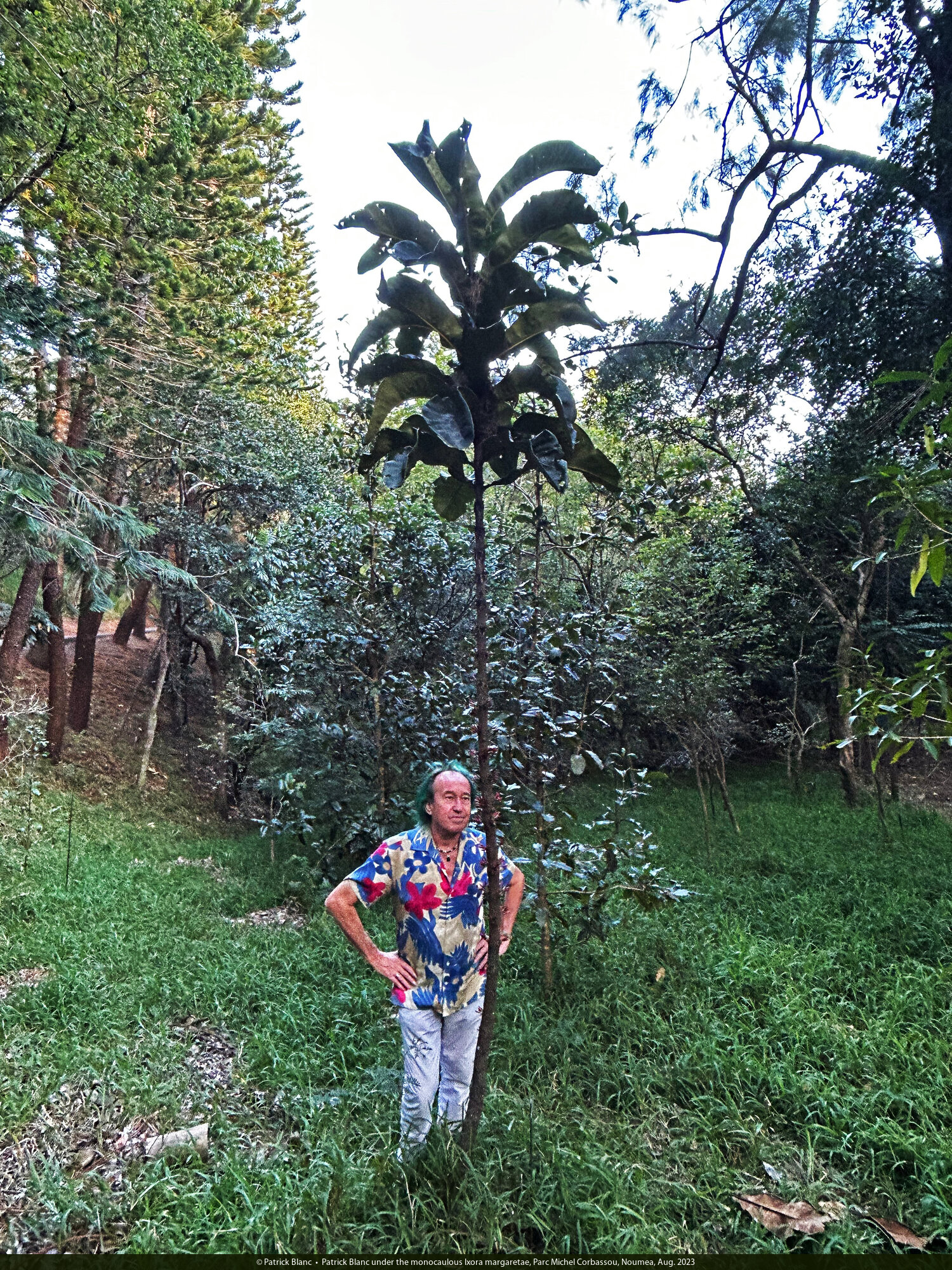 Patrick Blanc under the monocaulous Ixora margaretae, Parc Michel Corbassou, Noumea, Aug. 2023