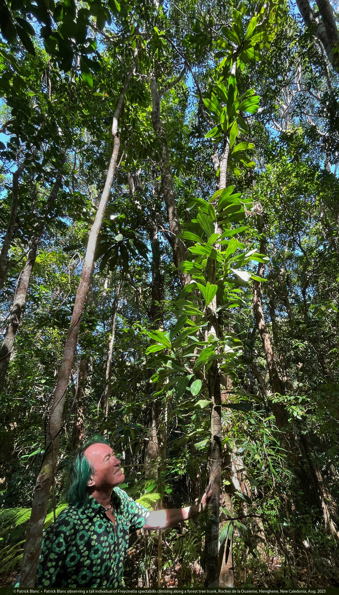 Patrick Blanc observing a tall individual of Freycinetia spectabilis climbing along a forest tree trunk, Roches de la Ouaieme, Hienghene, New Caledonia, Aug. 2023