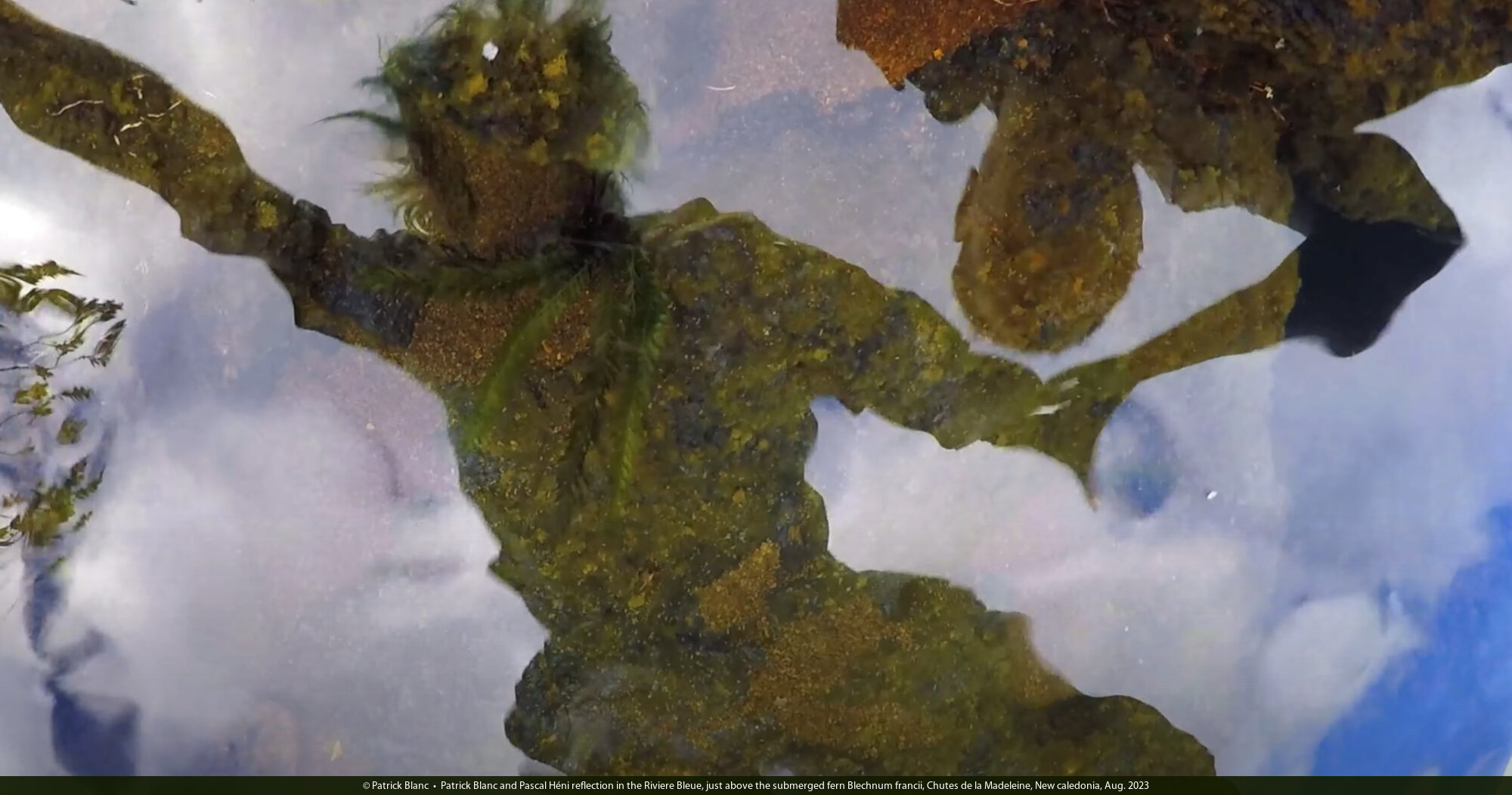 Patrick Blanc and Pascal Héni reflection in the Riviere Bleue, just above the submerged fern Blechnum francii, Chutes de la Madeleine, New caledonia, Aug. 2023