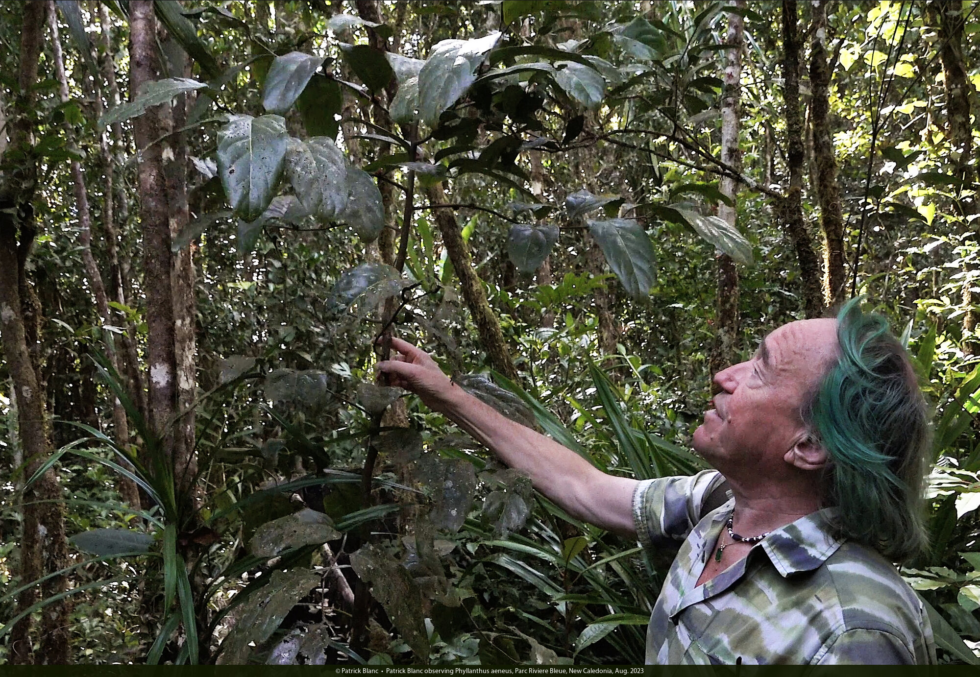 Patrick Blanc observing Phyllanthus aeneus, Parc Riviere Bleue, New Caledonia, Aug. 2023