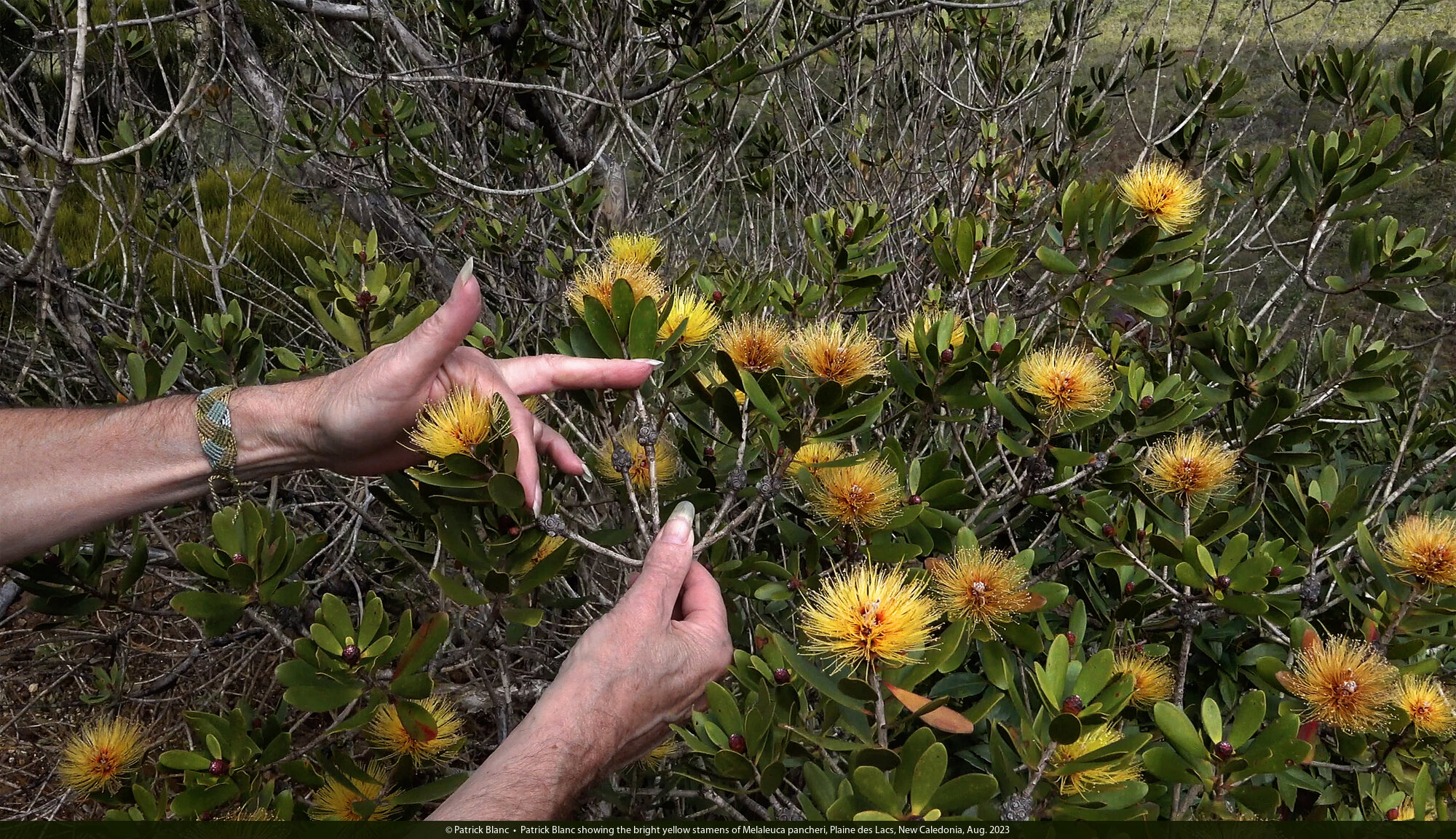 Patrick Blanc showing the bright yellow stamens of Melaleuca pancheri, Plaine des Lacs, New Caledonia, Aug. 2023