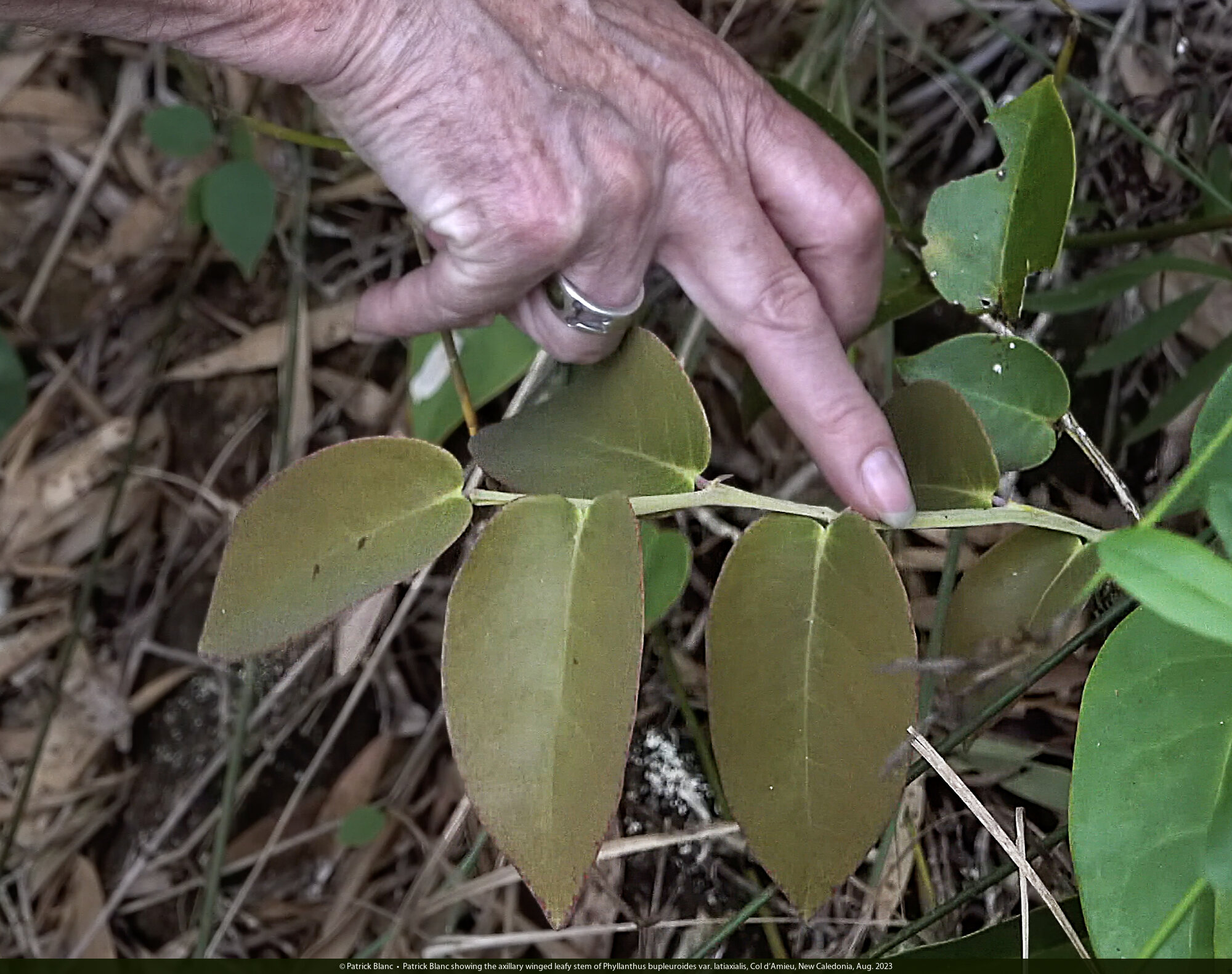 Patrick Blanc showing the axillary winged leafy stem of Phyllanthus bupleuroides var. latiaxialis, Col d'Amieu, New Caledonia, Aug. 2023