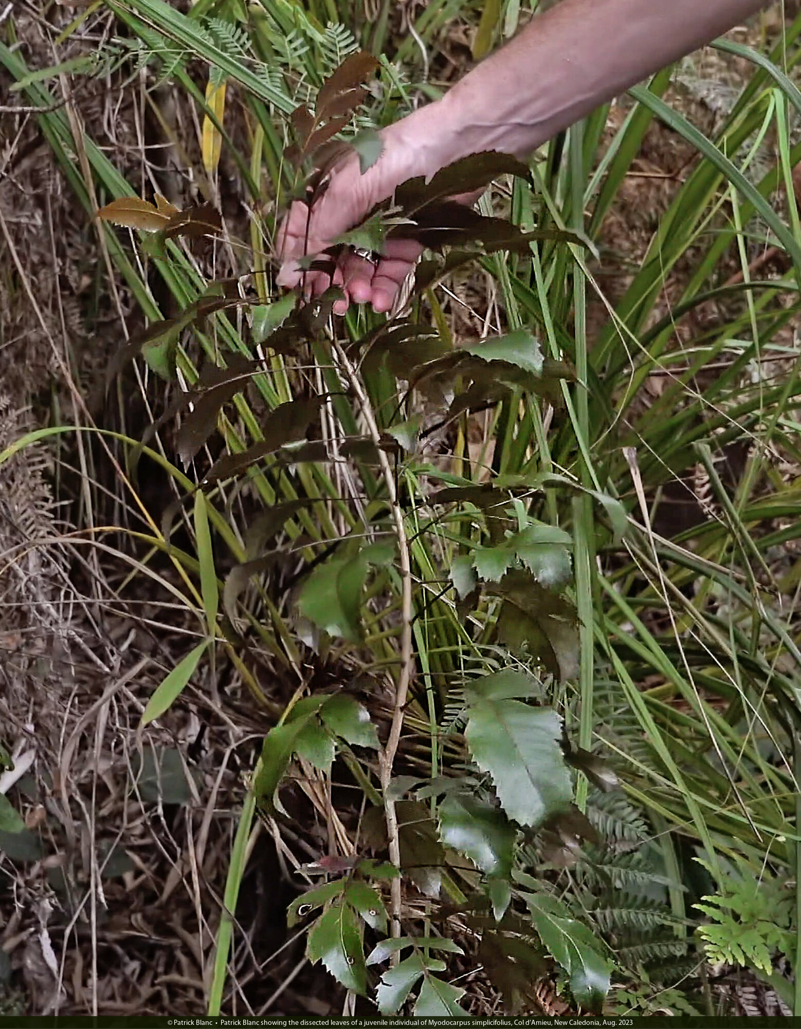Patrick Blanc showing the dissected leaves of a juvenile individual of Myodocarpus simplicifolius, Col d'Amieu, New Caledonia, Aug. 2023