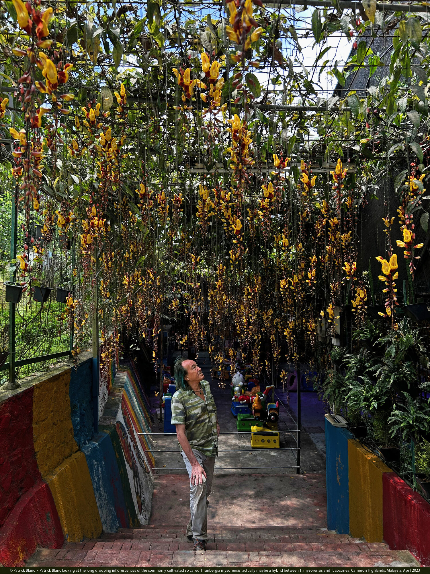 Patrick Blanc looking at the long drooping inflorescences of the commonly cultivated so called Thunbergia mysorensis, actually maybe a hybrid between T. mysorensis and T. coccinea, Cameron Highlands, Malaysia, April 2023