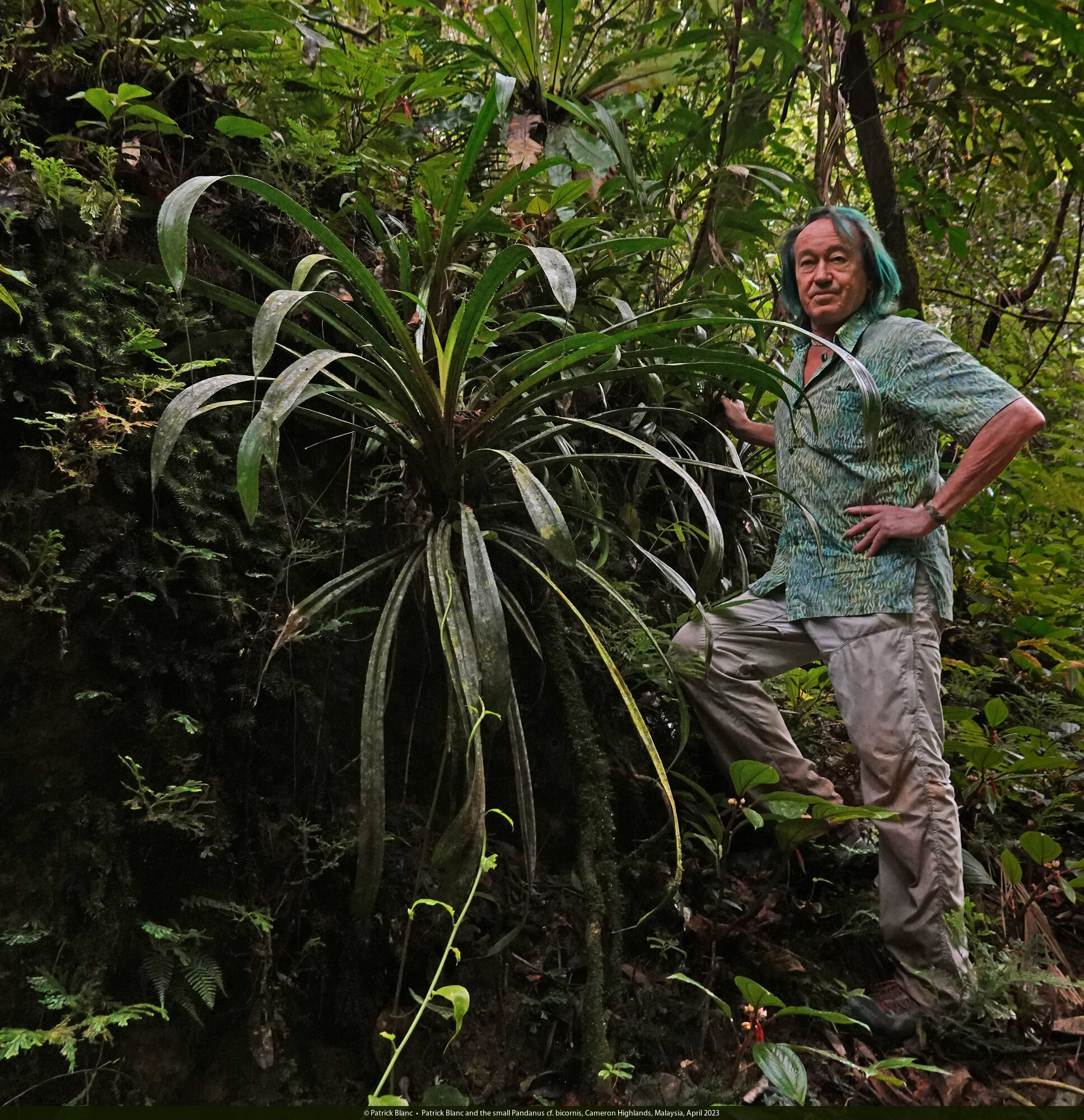 Patrick Blanc and the small Pandanus crinifolius, Cameron Highlands, Malaysia, April 2023