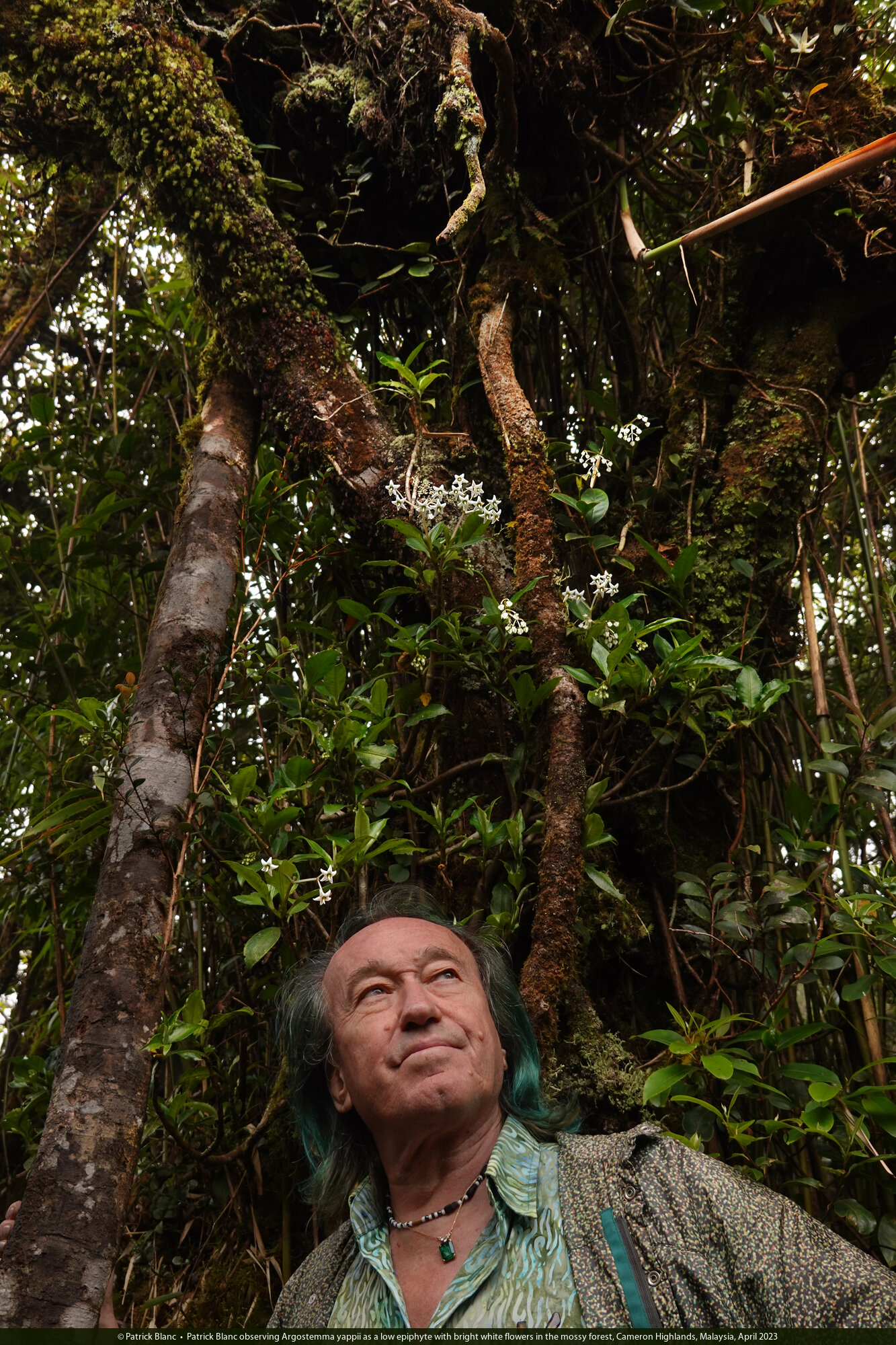 Patrick Blanc observing Argostemma yappii as a low epiphyte with bright white flowers in the mossy forest, Cameron Highlands, Malaysia, April 2023