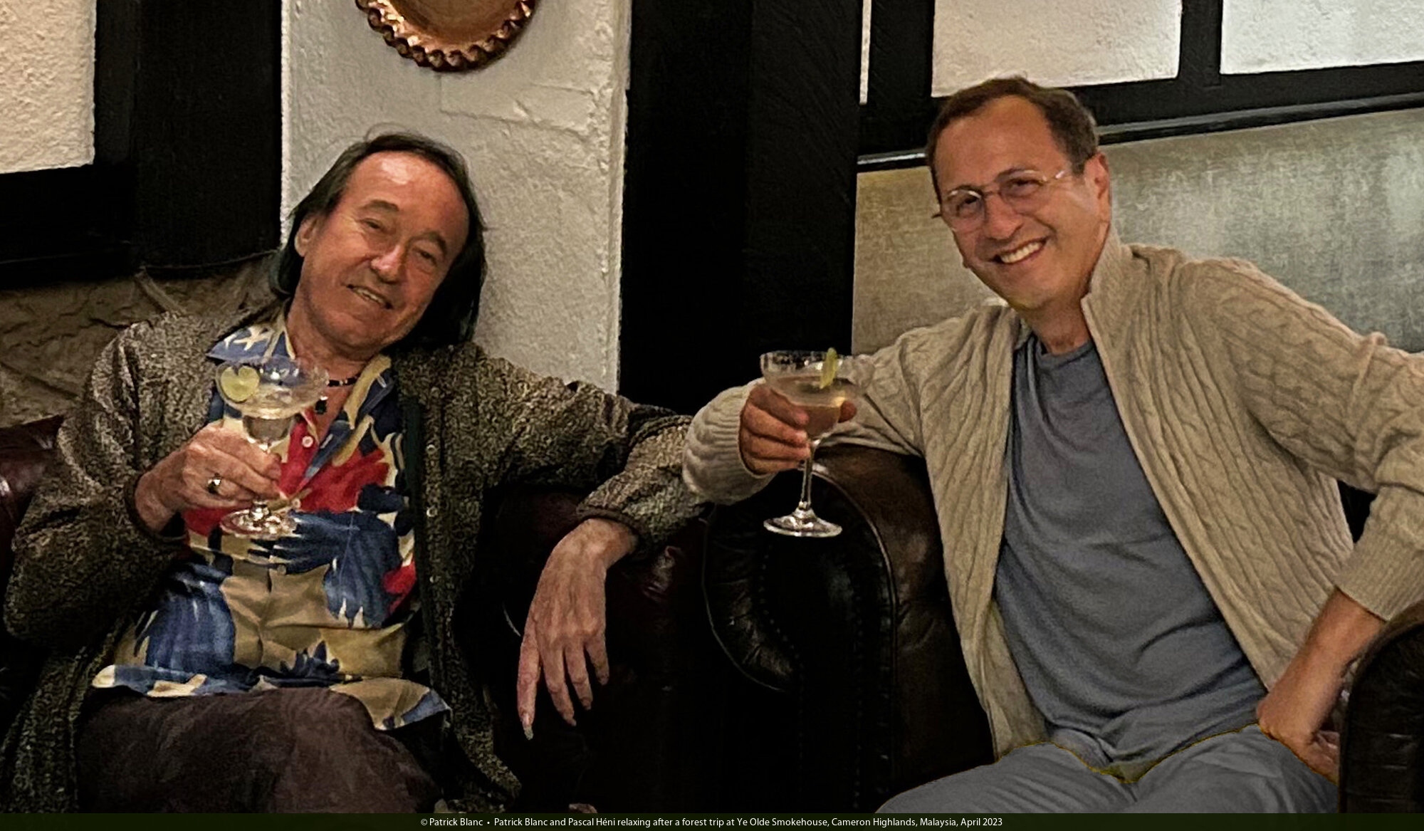 Patrick Blanc and Pascal Héni relaxing after a forest trip at Ye Olde Smokehouse, Cameron Highlands, Malaysia, April 2023
