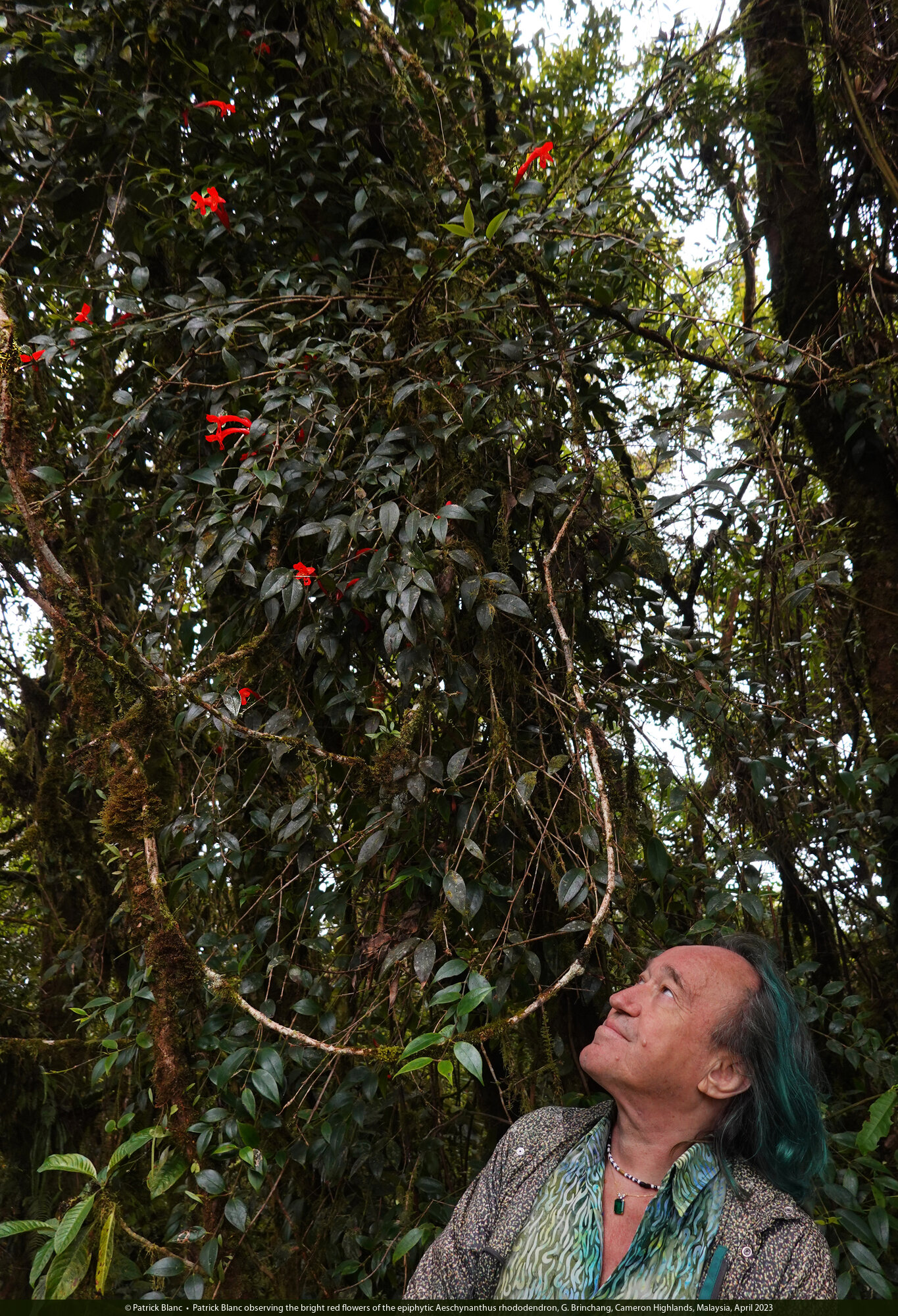 Patrick Blanc observing the bright red flowers of the epiphytic Aeschynanthus rhododendron, G. Brinchang, Cameron Highlands, Malaysia, April 2023