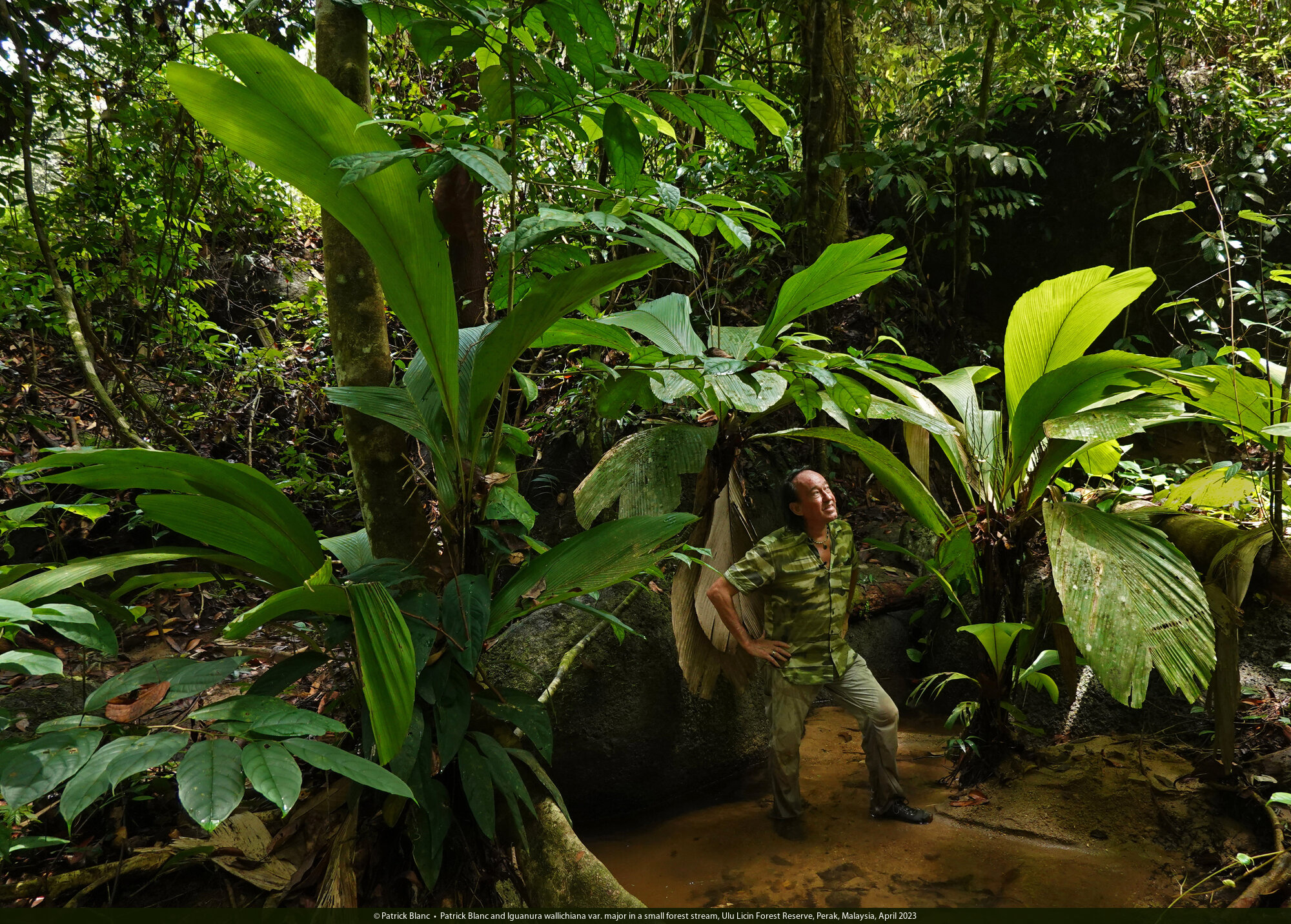Patrick Blanc and Iguanura wallichiana var. major in a small forest stream, Ulu Licin Forest Reserve, Perak, Malaysia, April 2023