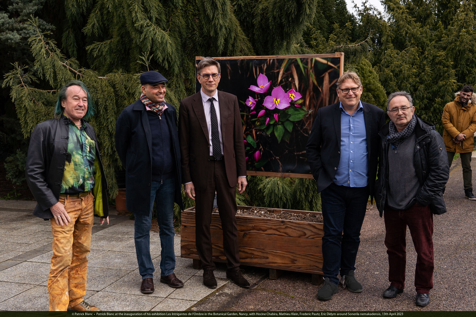 Patrick Blanc at the inauguration of his exhibition Les Intrigantes de l'Ombre in the Botanical Garden, Nancy, with Hocine Chabira, Mathieu Klein, Frederic Pautz, Eric Didym around Sonerila nemakadensis, 13th April 2023