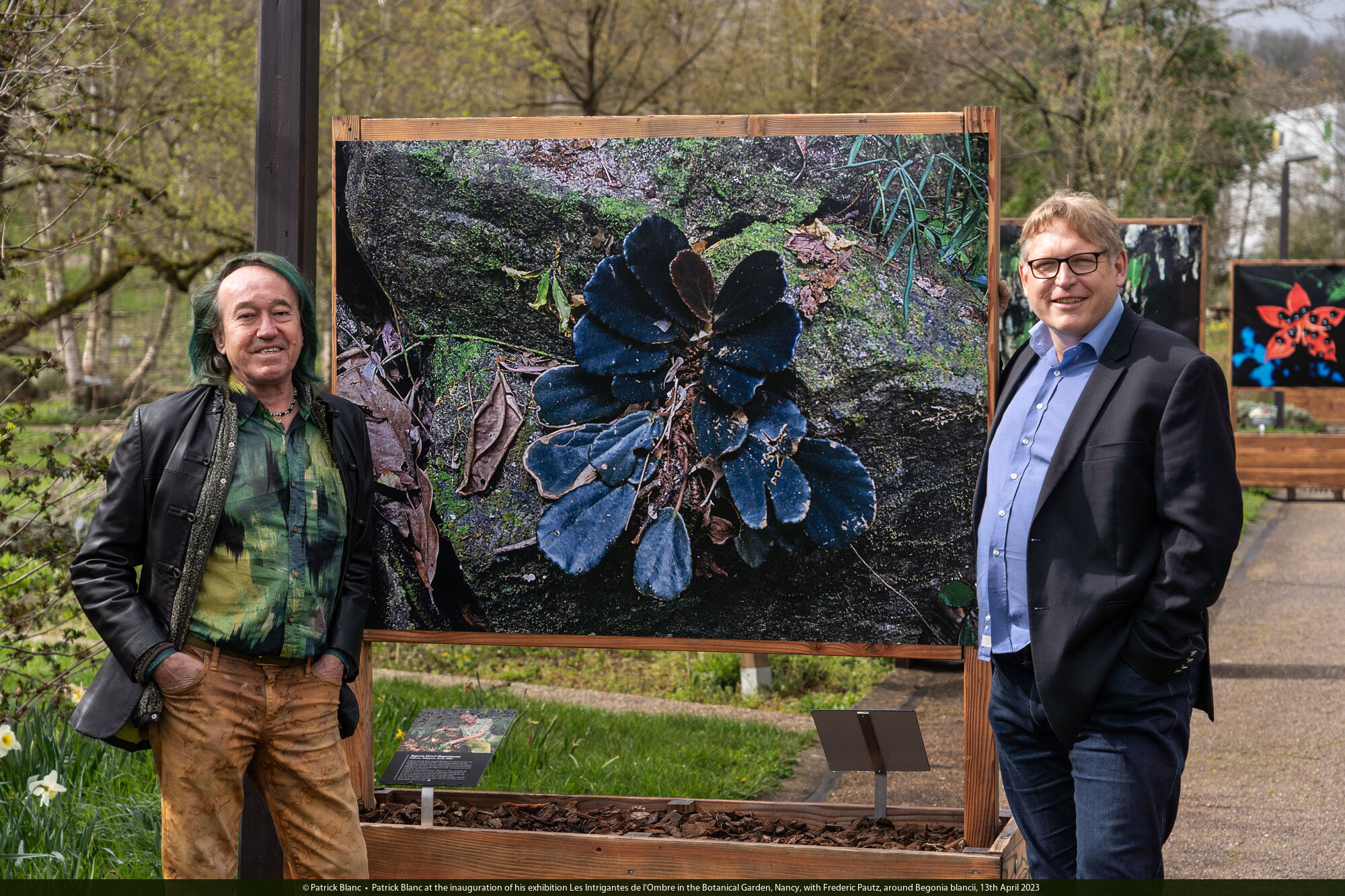 Patrick Blanc at the inauguration of his exhibition Les Intrigantes de l'Ombre in the Botanical Garden, Nancy, with Frederic Pautz, around Begonia blancii, 13th April 2023