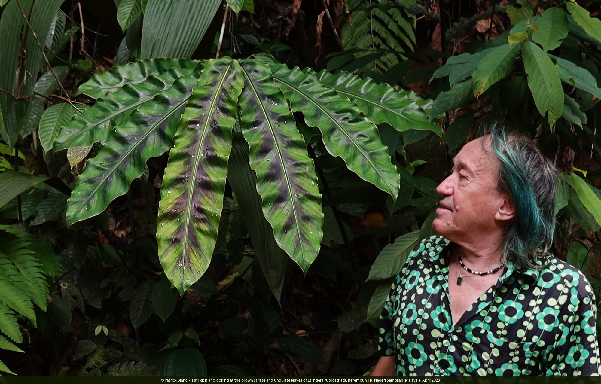 Patrick Blanc looking at the brown striate and undulate leaves of Etlingera rubrostriata, Berembun FR, Negeri Sembilan, Malaysia, April 2023