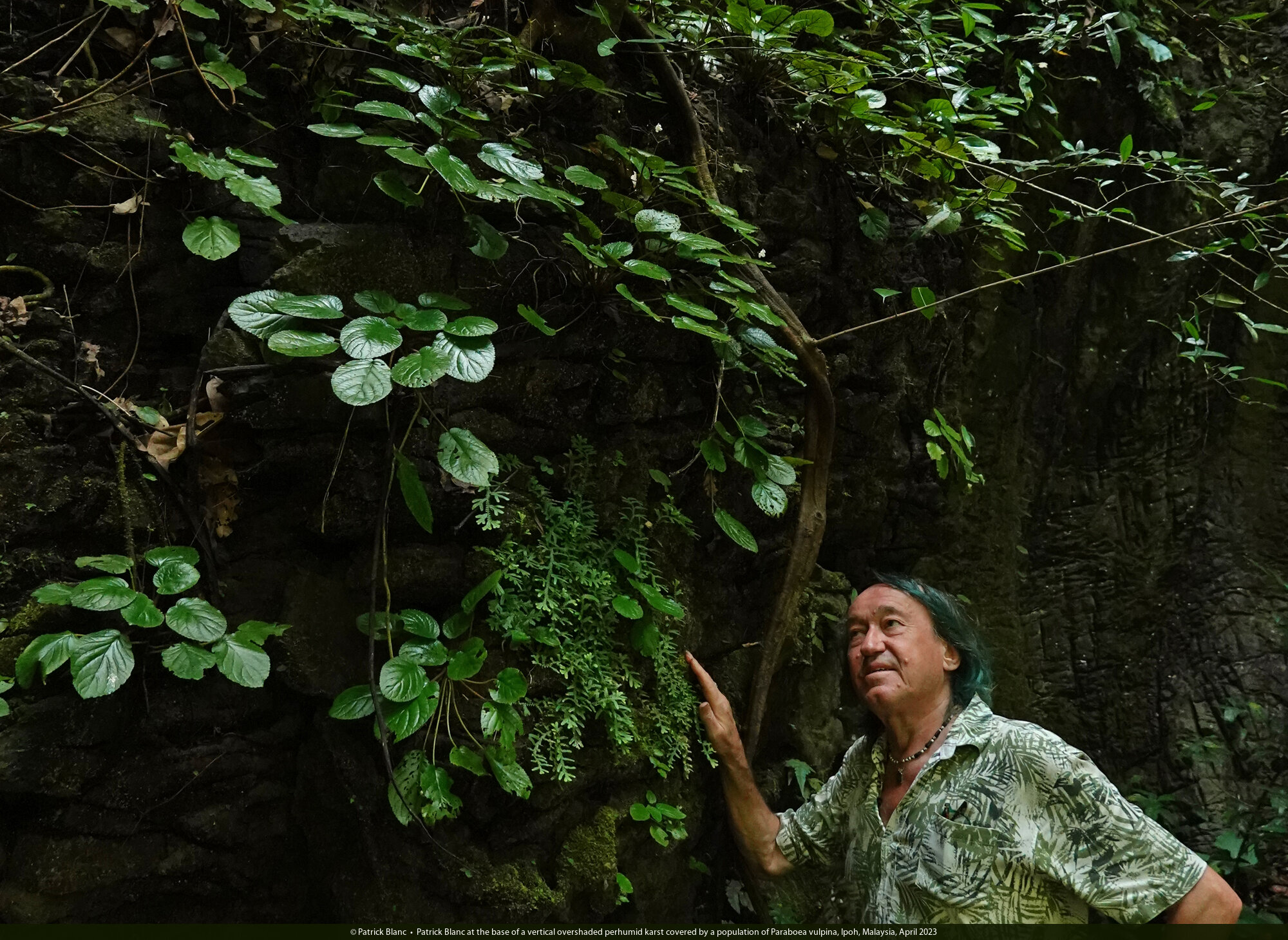 Patrick Blanc at the base of a vertical overshaded perhumid karst covered by a population of Paraboea vulpina, Ipoh, Malaysia, April 2023