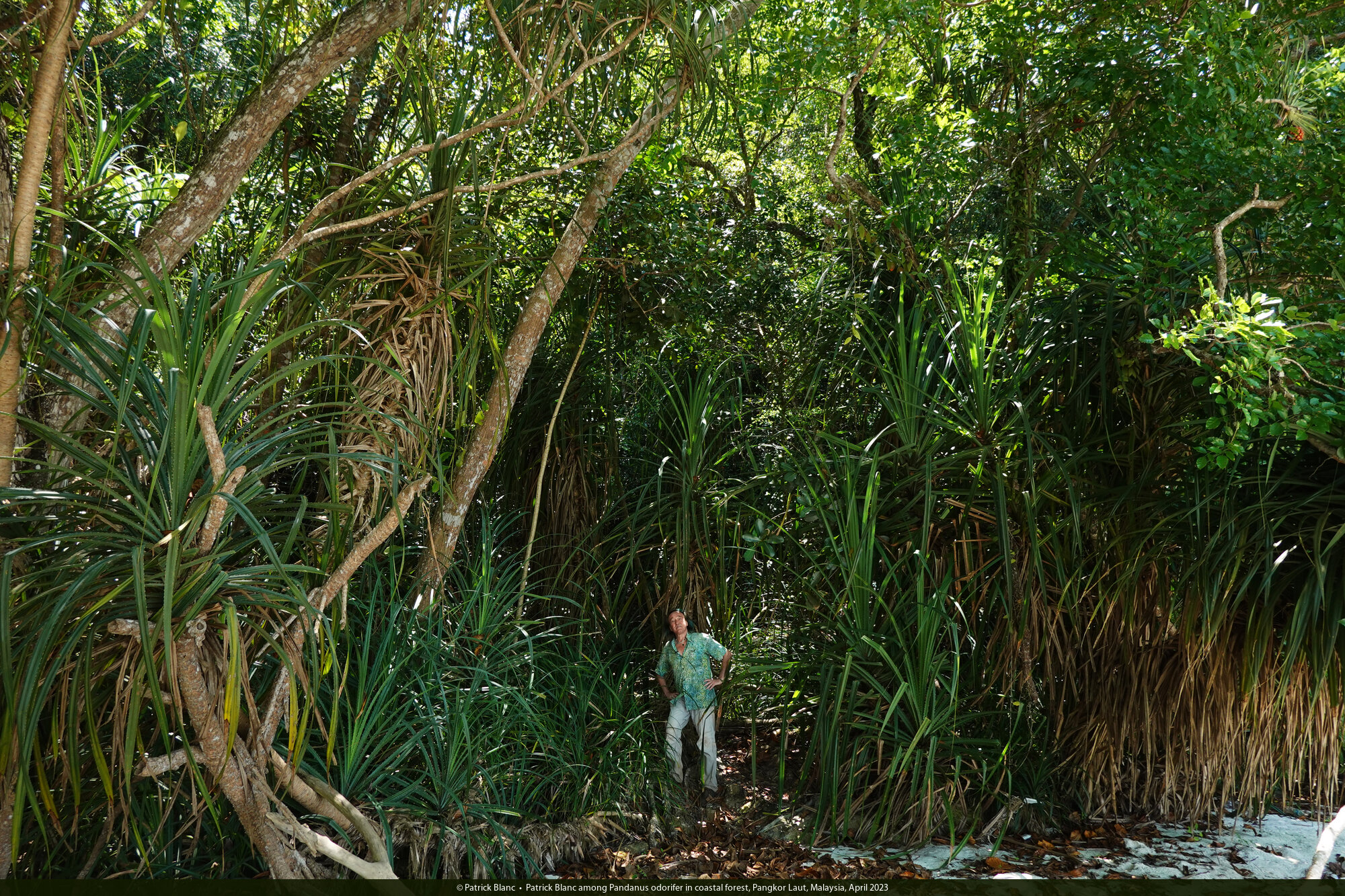 Patrick Blanc among Pandanus odorifer in coastal forest, Pangkor Laut, Malaysia, April 2023