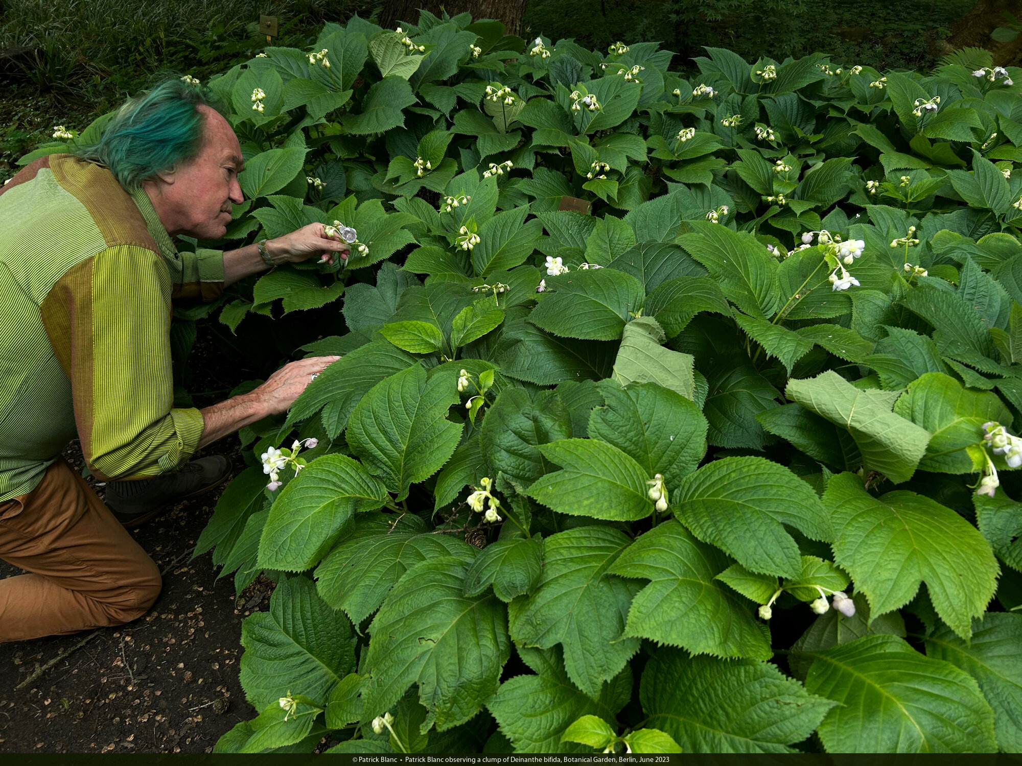 Patrick Blanc observing a clump of Deinanthe bifida, Botanical Garden, Berlin, June 2023