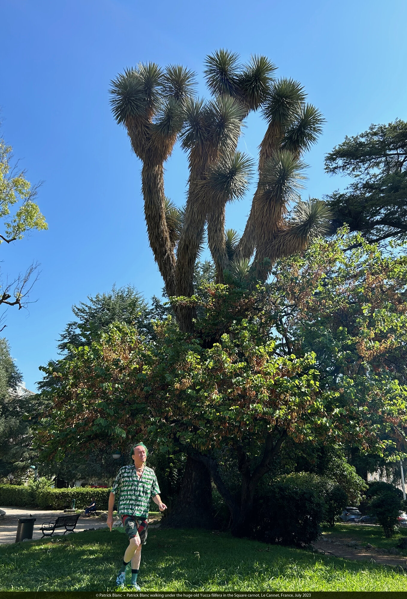 Patrick Blanc walking under the huge old Yucca filifera in the Square carnot, Le Cannet, France, July 2023