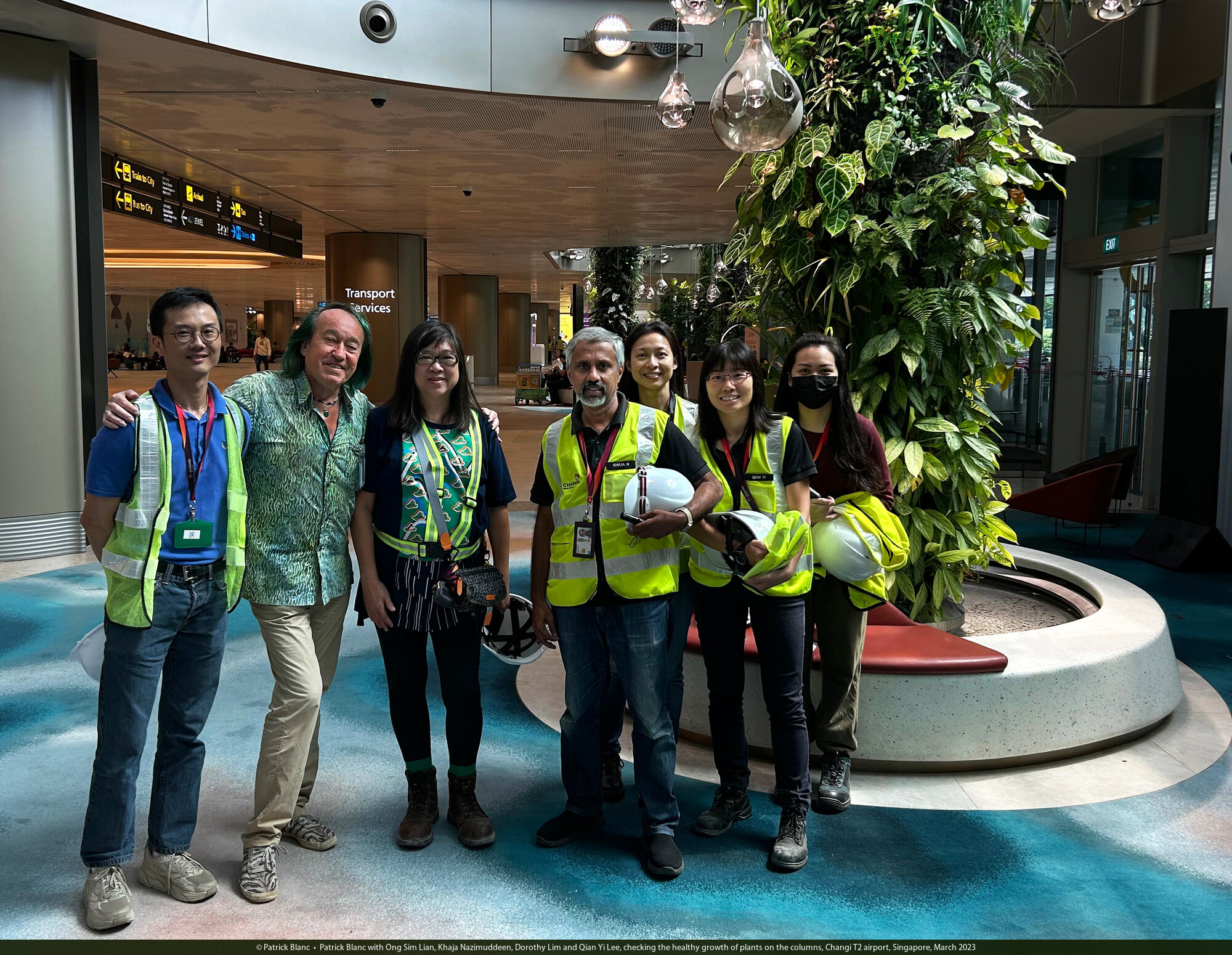 Patrick Blanc with Ong Sim Lian, Khaja Nazimuddeen, Dorothy Lim and Qian Yi Lee, checking the healthy growth of plants on the columns, Changi T2 airport, Singapore, March 2023