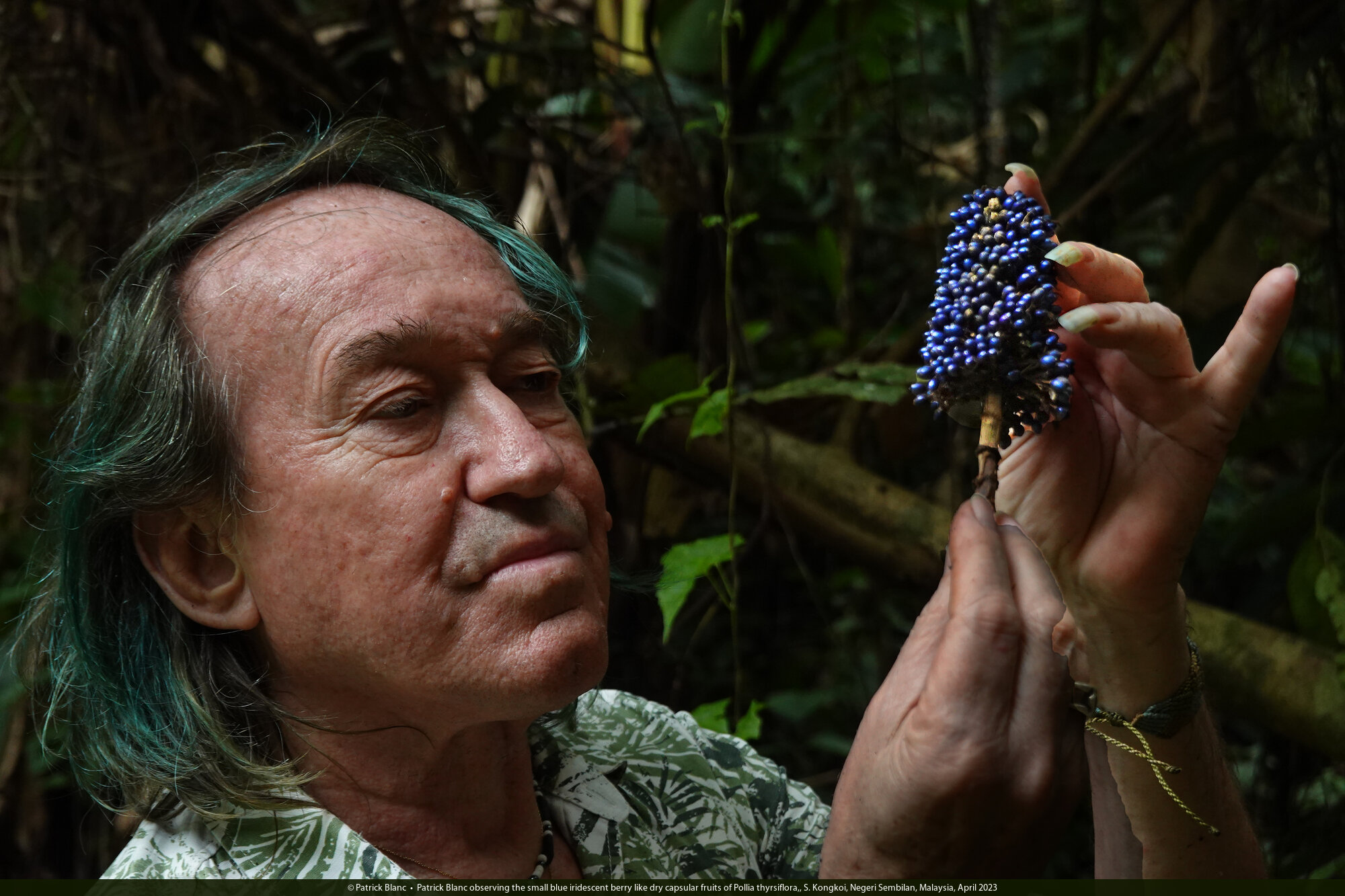 Patrick Blanc observing the dark purple berries of Medinilla speciosa, Cameron Highlands, Malaysia, April 2023