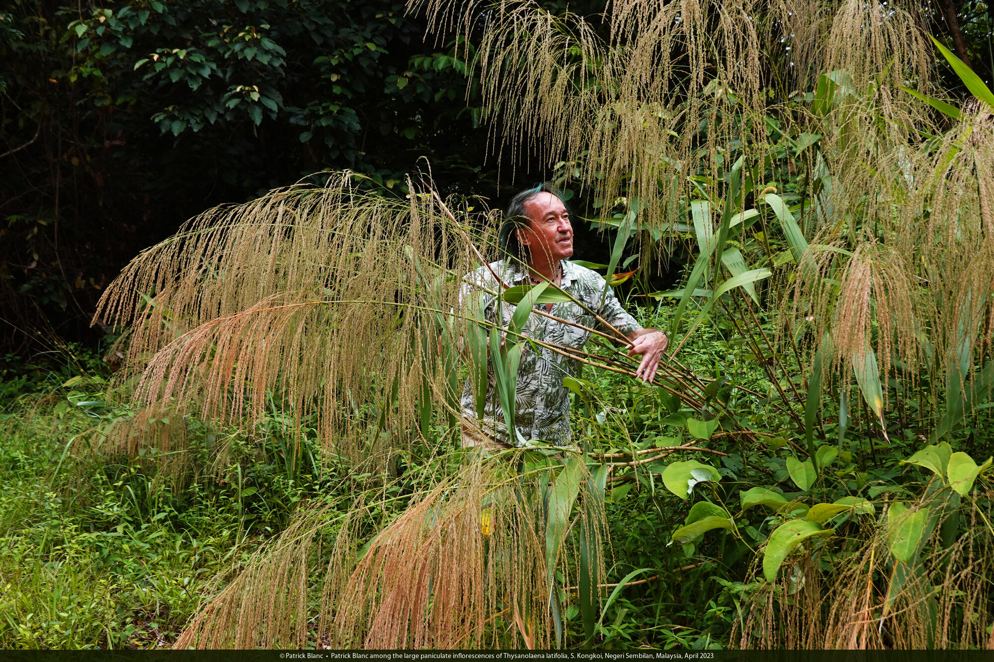Patrick Blanc among the large paniculate inflorescences of Thysanolaena latifolia, S. Kongkoi, Negeri Sembilan, Malaysia, April 2023