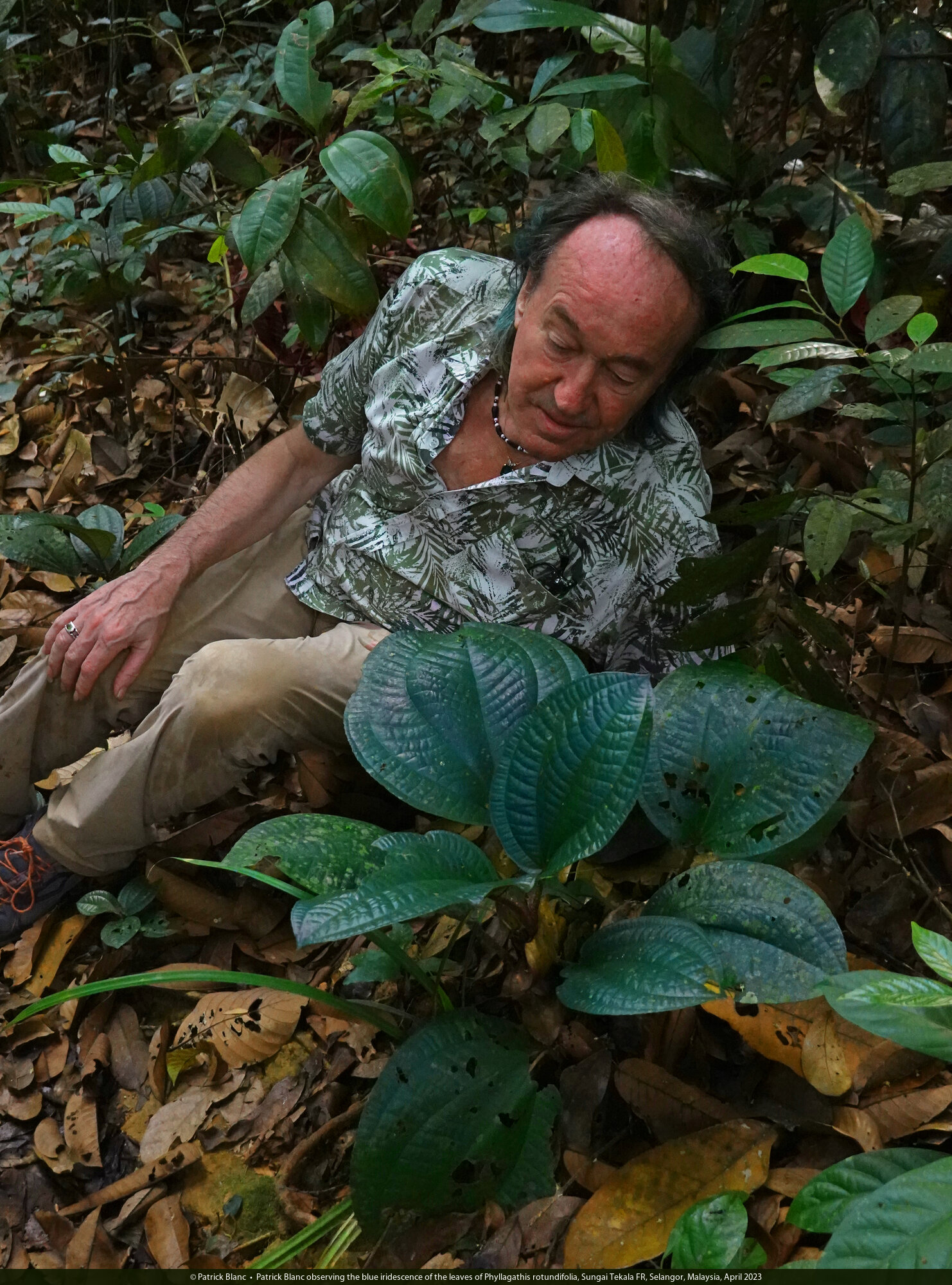Patrick Blanc observing the blue iridescence of the leaves of Phyllagathis rotundifolia, Sungai Tekala FR, Selangor, Malaysia, April 2023
