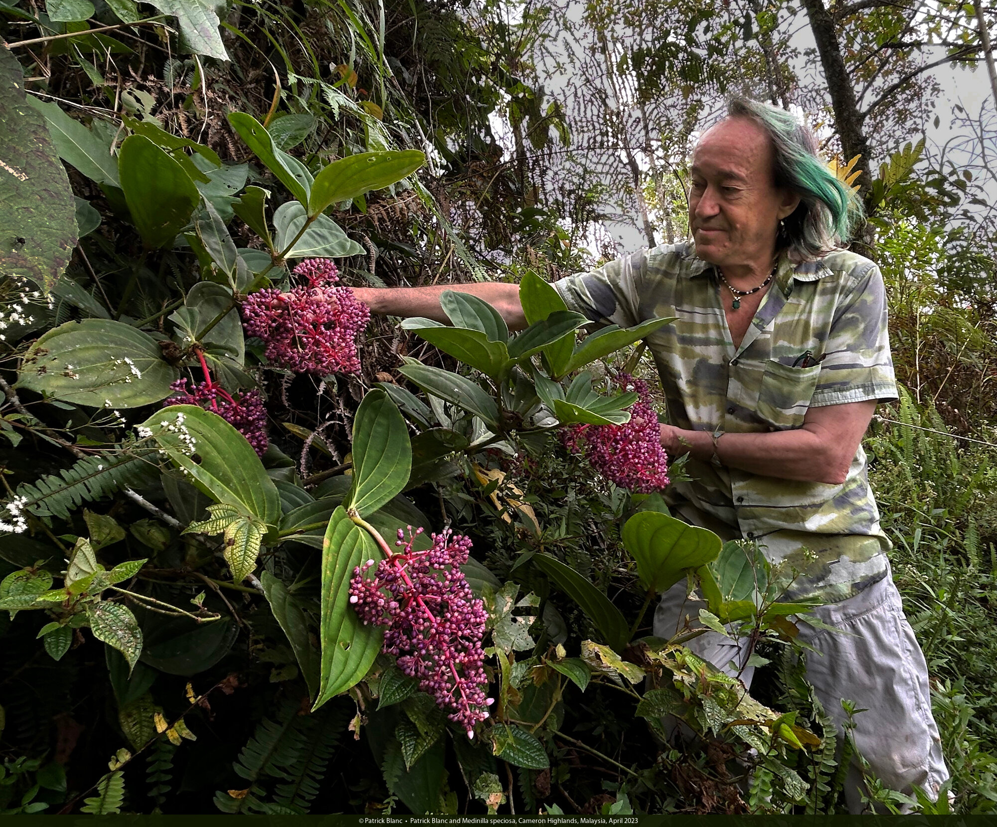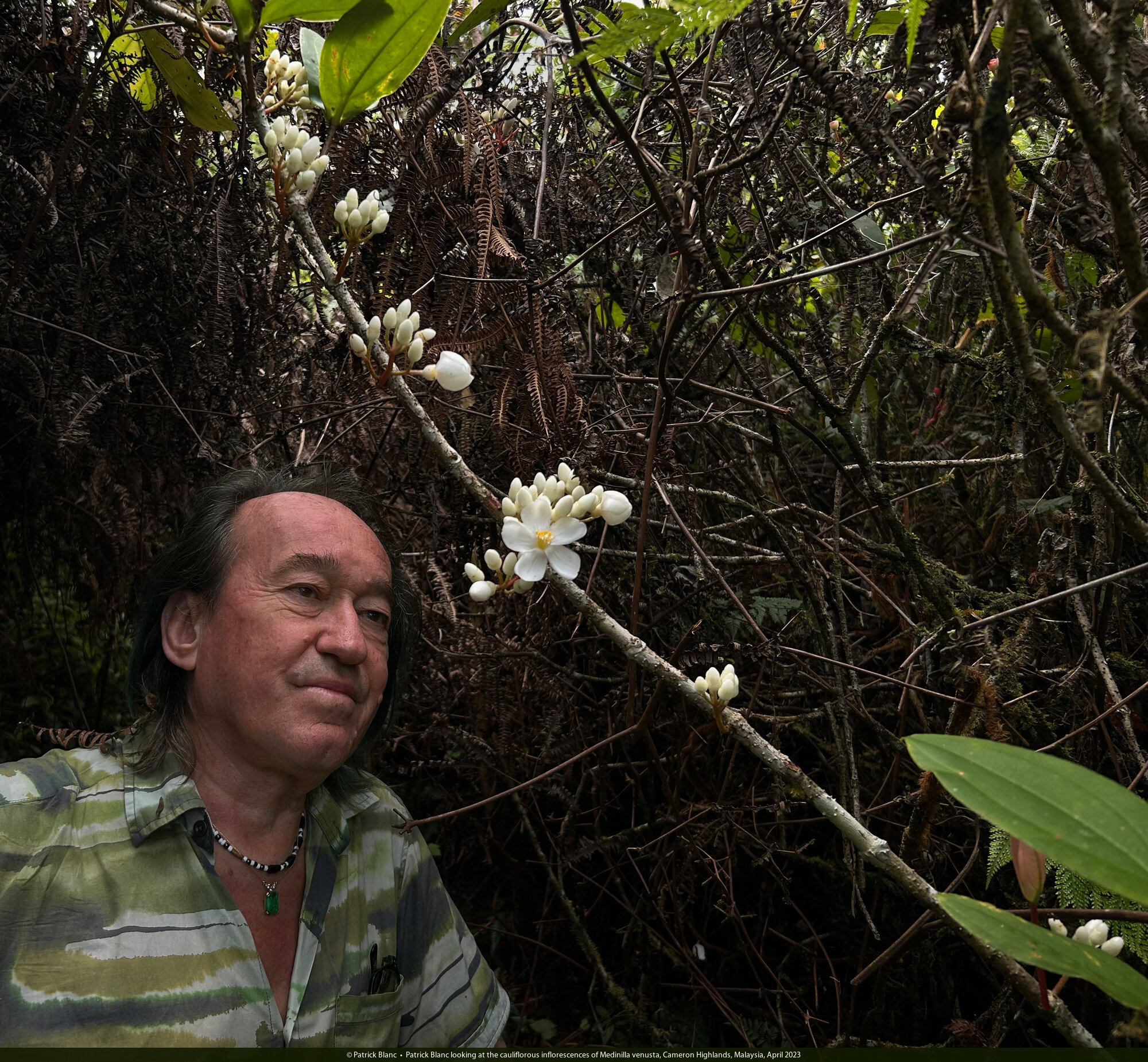 Patrick Blanc observing the cauliflorous inflorescences of Medinilla venusta, Cameron Highlands, Malaysia, April 2023