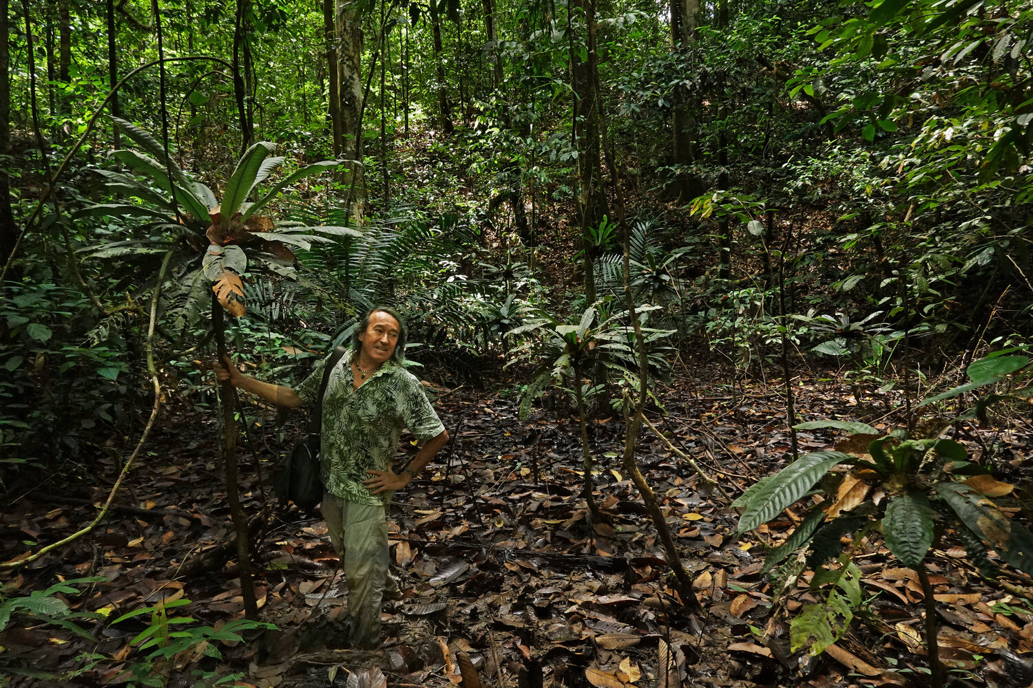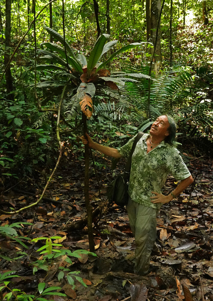 Patrick Blanc observing the upright growing stems of an hemiepiphytic Schefflera, Brahmagiri WS, Karnataka, India, Jan. 2023